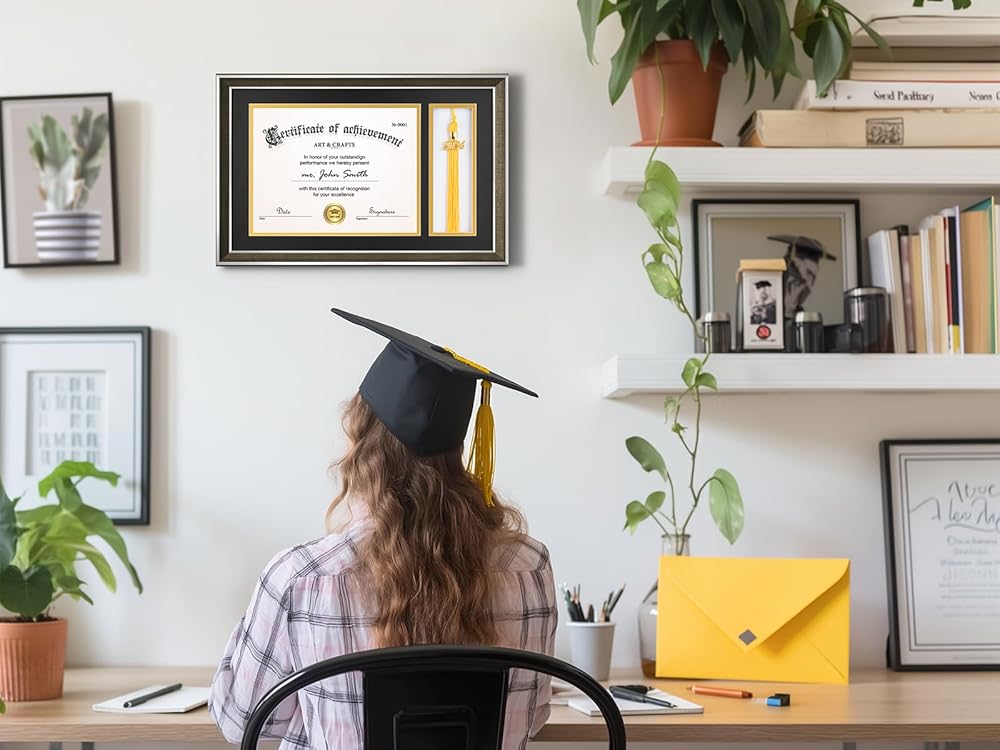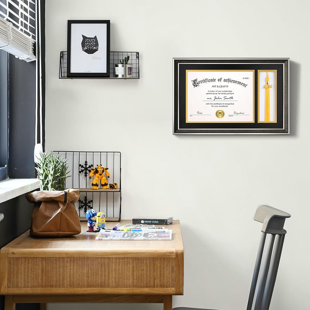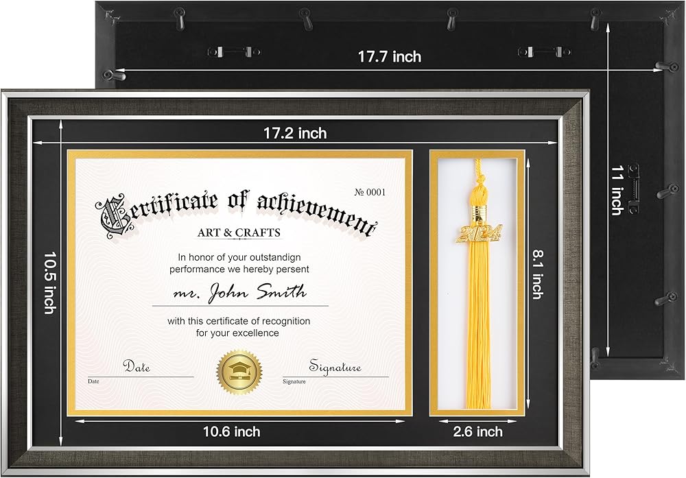 【Display Size】Opening size for 8.5x11 inch diploma / certificate, Picture opening size is 4x6 inch, Tassel opening size is 8x1.8 inch. Card opening size is 1.5x3.7. The outer dimension of the frame is 23.5x12.5x1.3 inch.