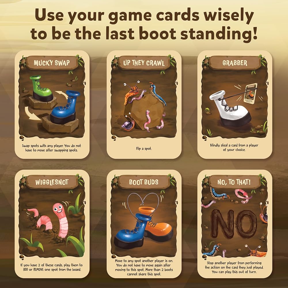 لعبة لوحية مثيرة للاستراتيجية والحظ: اربط حذائك العملاق وتنقل في التضاريس الموحلة! تغلب على خصومك وتجنب سحق المخلوقات للبقاء في اللعبة. وضع استراتيجية وتكون آخر حذاء يقف!