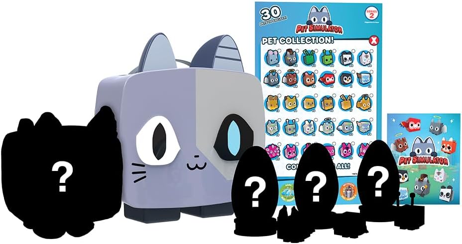 Half cat, half machine; all adorable! It's the Cyborg Cat Mystery Collector Bundle (Series 2), from the hit-game Pet Simulator X. This reusable 9" storage container pops open to reveal 8 collectible items inside! This instant collection includes: 1 Mystery Plush, 3 Mystery Eggs, 1 Sticker Sheet, 1 Collector Sheet, and 2 DLC codes! These codes can be redeemed for in-game rewards, which include 1 Legendary DLC and 1 Exclusive DLC. If you love futuristic fur-balls, you've got to bring home the this cybernetic collection today!