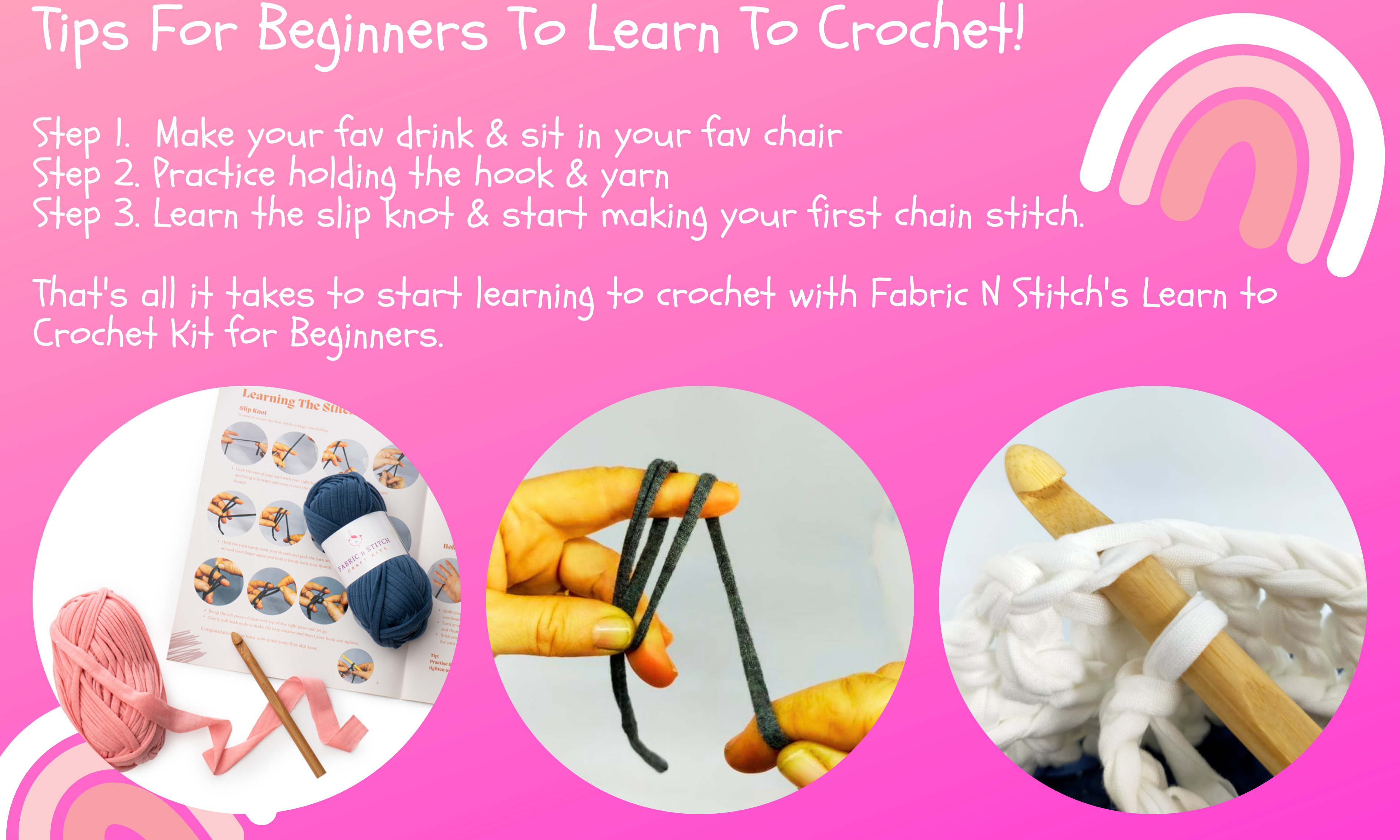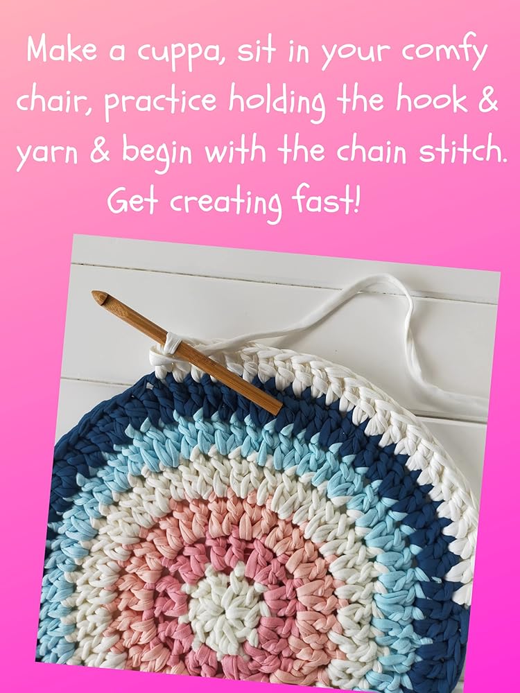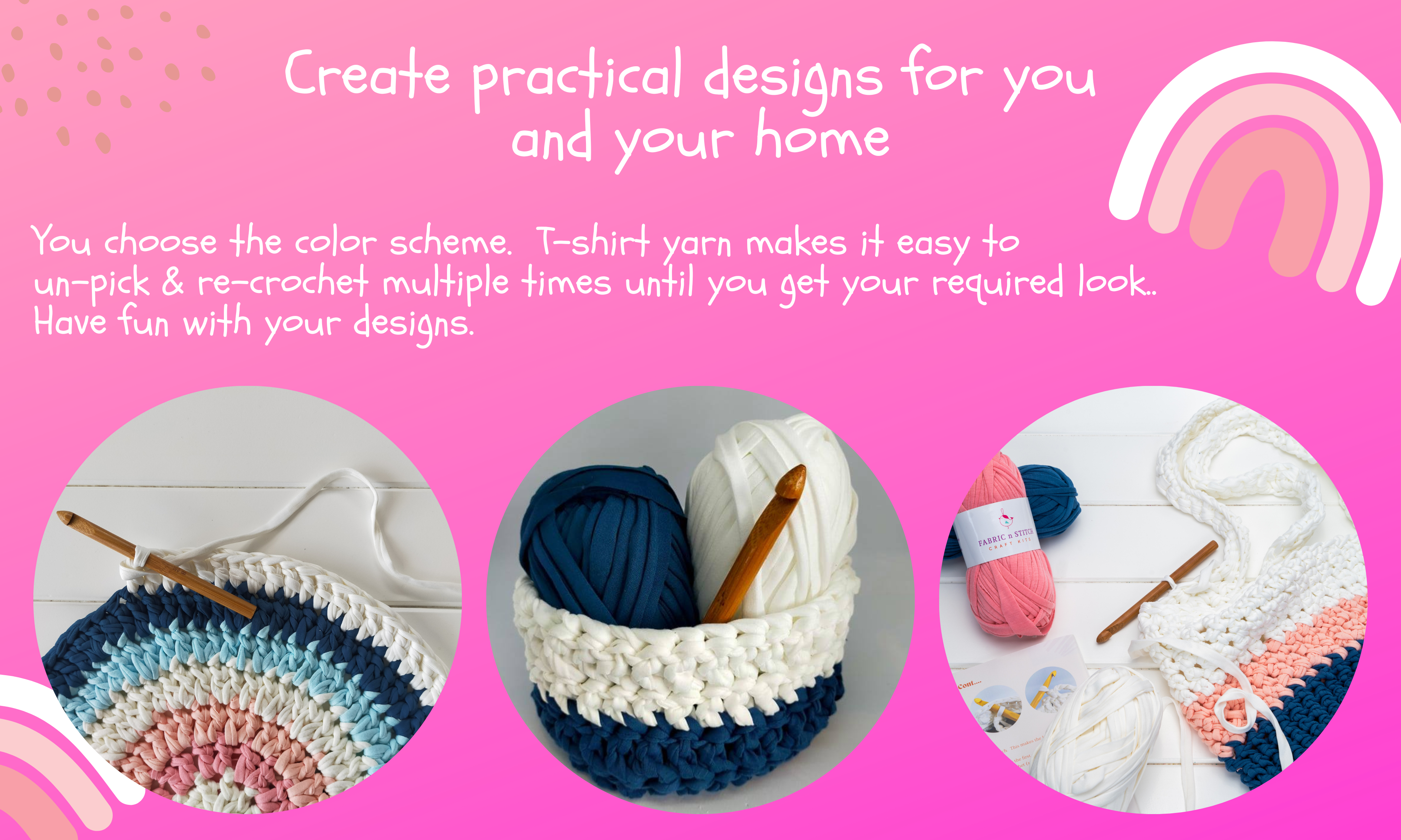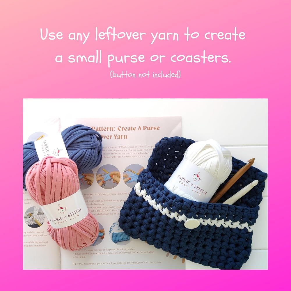 مجموعة أدوات الكروشيه FABRIC n STITCH للمبتدئين من عمر 13 عامًا فما فوق. كروشيه مفرش طاولة وسلة وحقيبة كتف ومحفظة بخيوط تي شيرت مكتنزة. تشتمل المجموعة على كل ما تحتاجه لتجربة الحياكة.