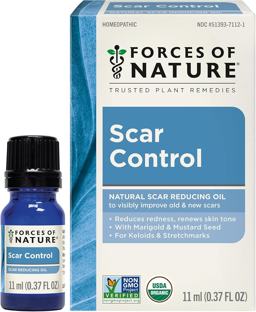 Forces of Nature natural Scar Control helps reduce the appearance of old or new scars resulting from injury, surgery, stretch marks and acne effectively while nourishing and moisturizing your damaged skin. Our natural Scar Control works on reducing keloid scars caused by injuries or surgery. Contractures scars or burn scars that leave the skin tighter and can often go deeper affecting muscle or nerves. Hypertrophic scars are due to excessive amounts of collagen creating deep layers leaving a raised appearance. And Atrophic scars (acne scars) below the surface of the normal skin tissue appearing pitted or sunken, as well as on Stretch marks.