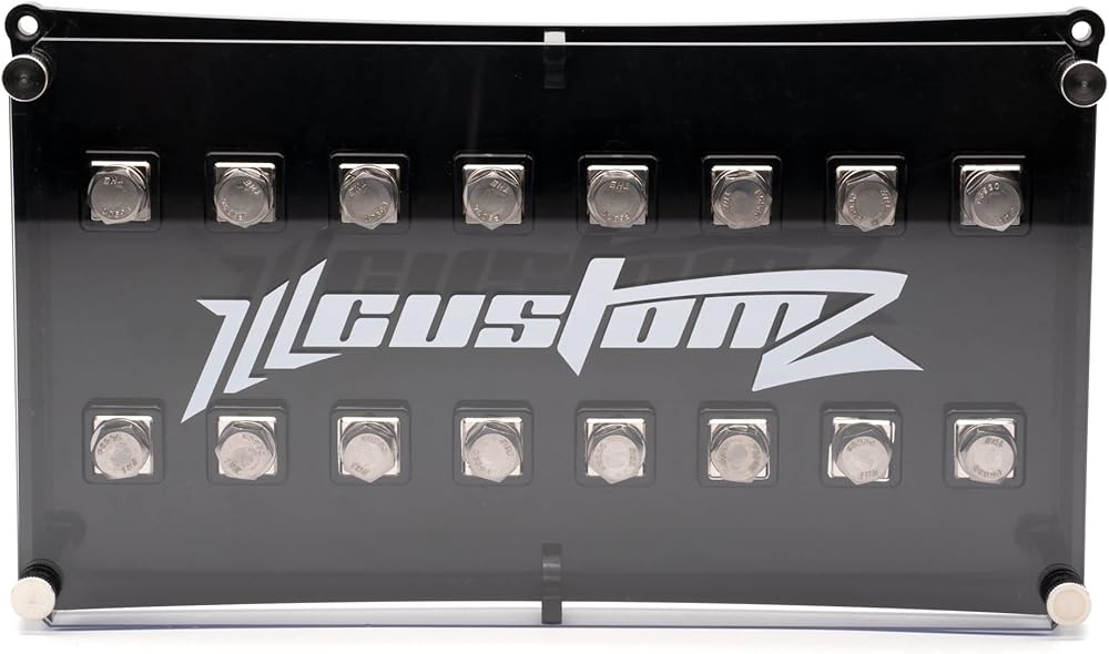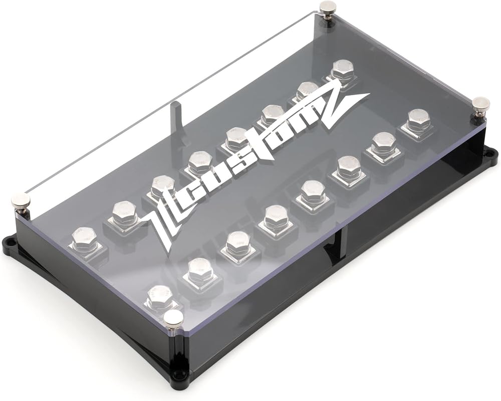 ILL Customz Lug Style ANL Fuse Blocks Crafted with precision and uniquely designed to stand out from the competition to make your build as ILL as possible. Made from injection molded high temp ABS plastic Plexi Cover with Silk Screen printed Logo Nickel Plated 6061 Aluminum mounting blocks (molded into the base not epoxied) Uses hand tightening Stainless Steel thumb screws Threaded metal inserts that are molded into the base to stop stripping Comes with stainless steel 5/16-18 bolts Comes preassembled DOES NOT INCLUDE LUGS OR FUSES