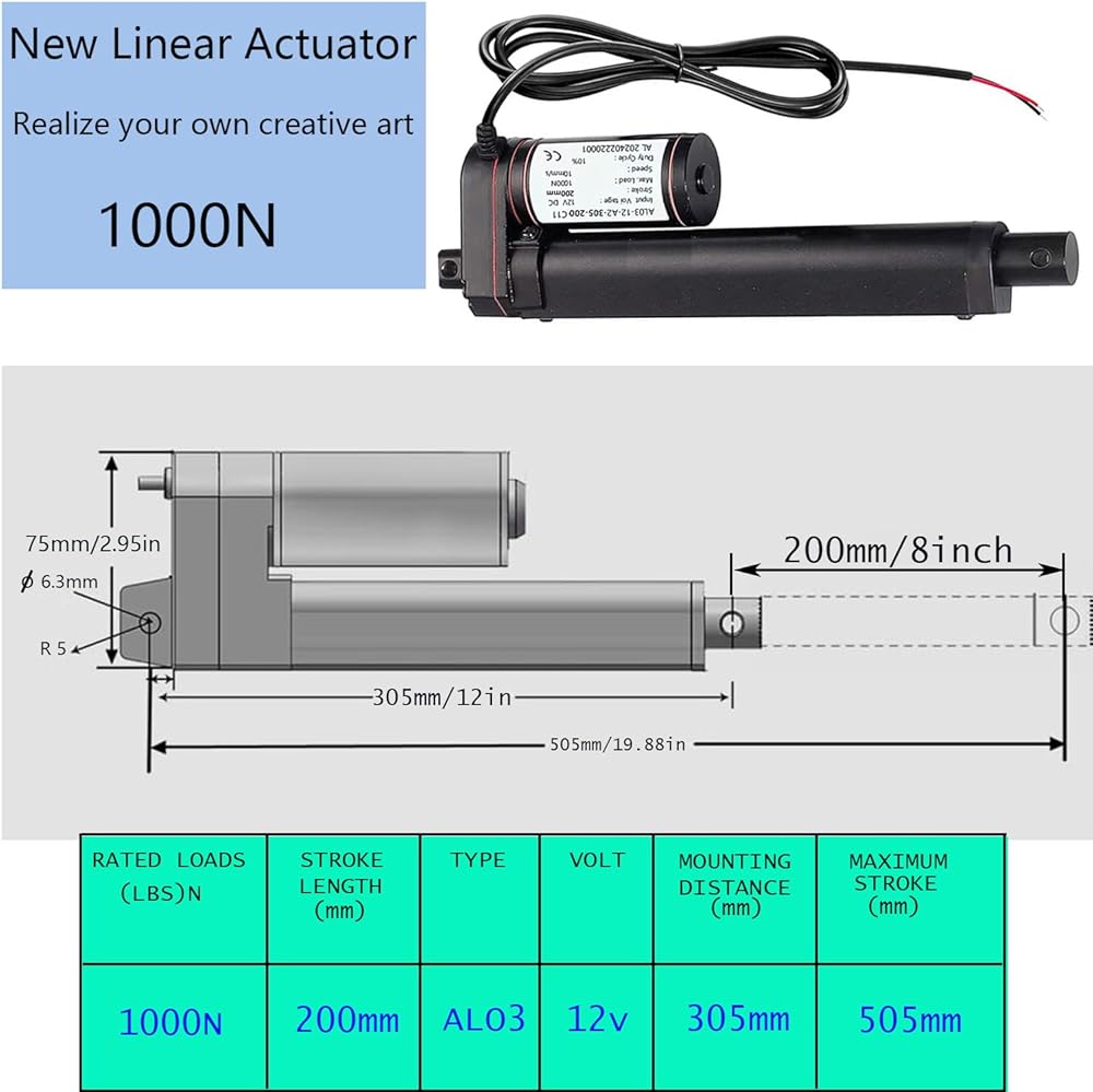 Heavy Duty DC 12V 8 Inch Linear Actuator,1000N High Speed 10mm/s Linear Actuator with Instantaneous Waterproof Switch with Mounting Bracket,for Automotive RV Electric Door Opener (200mm)