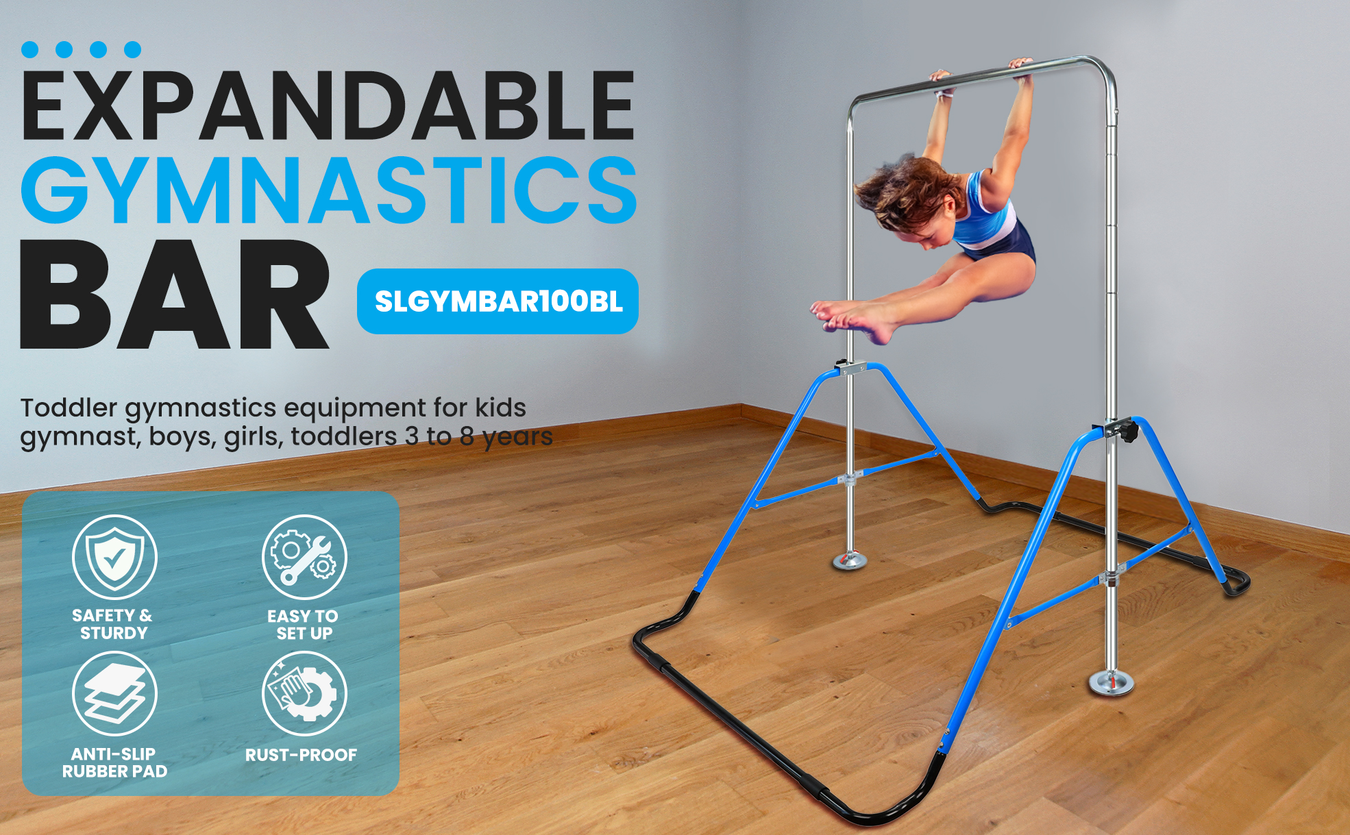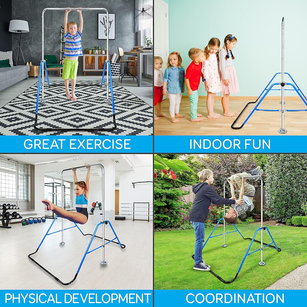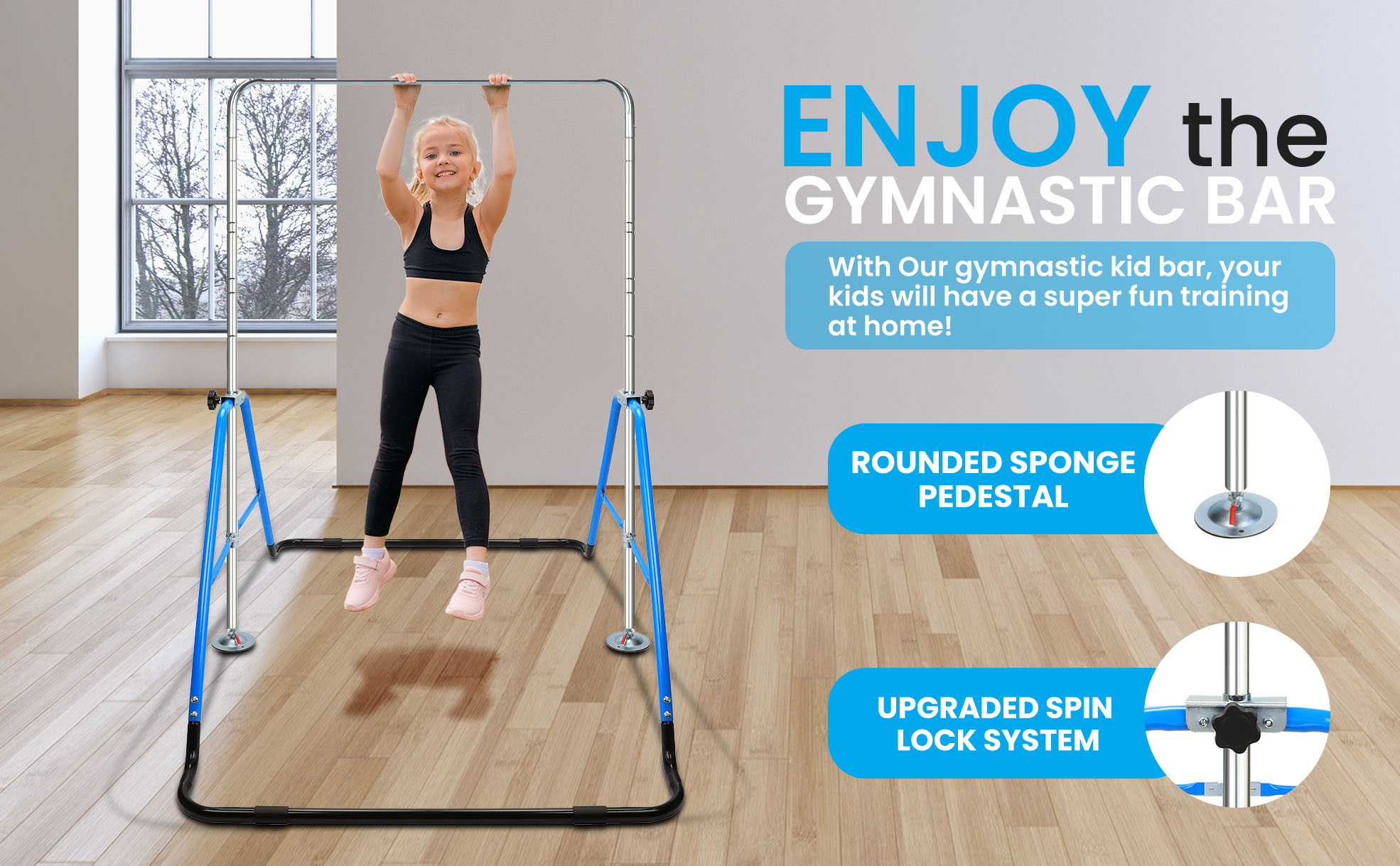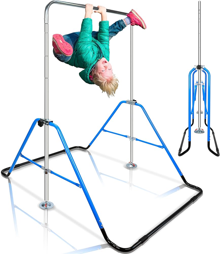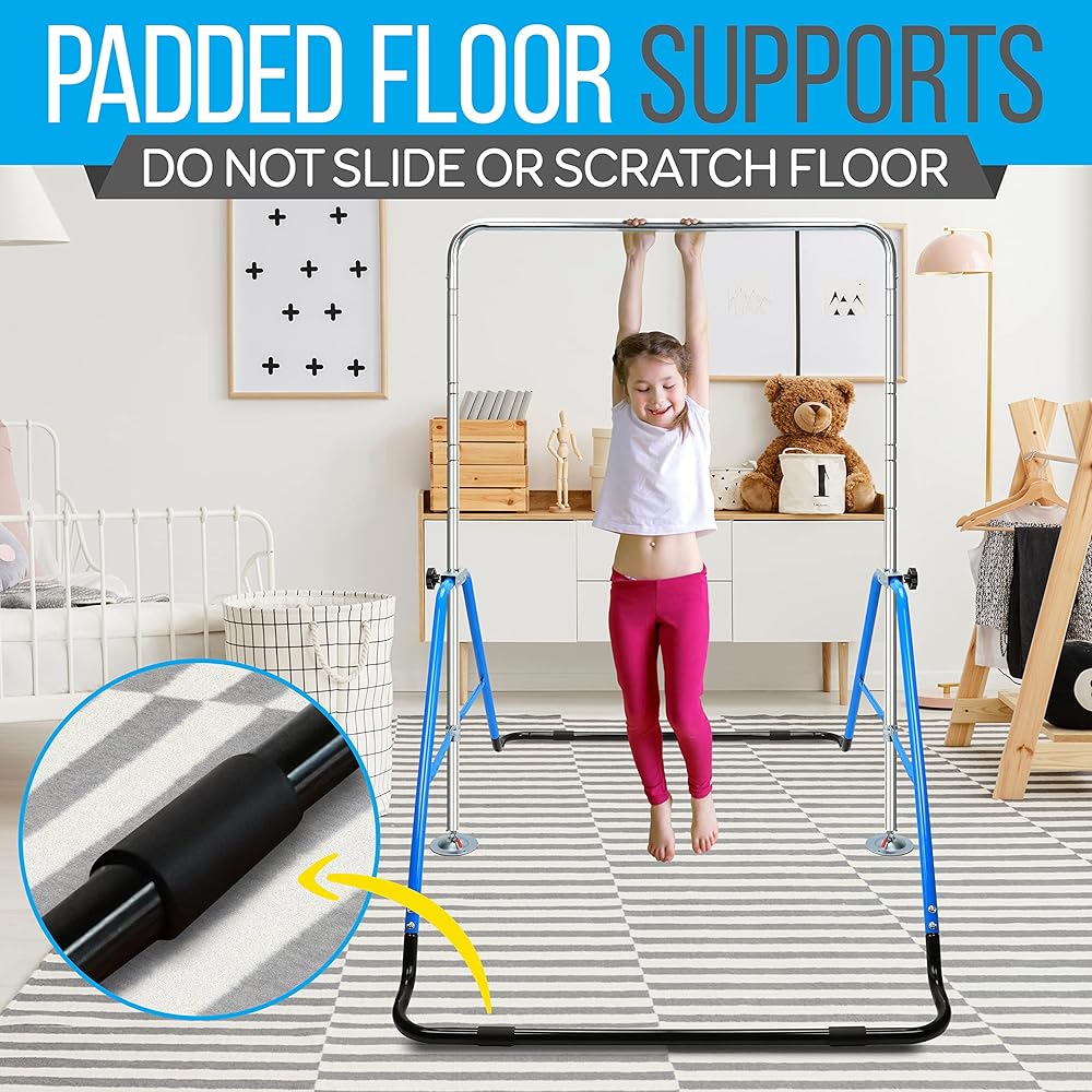 Features: - Safe and Sturdy Gymnastic Bar - Adjustable Height Gymnastic Horizontal Bar - Training Monkey Bars for Kids - Foldable to Save Space - Designed Based on the Triangle Structure for Stability and Security - Easy to Set Up - Upgraded Spin Lock System - Easy Adjustment and More Secure Lock - Rounded Sponge Pedestal - Anti-Slip Rubber Pad - Powder Coated Finish - Rust-proof and Anti-Scratch - Bilaterally Adjustable for Better Floor Support What's in the Box: - (1) Set of Expandable Safely Fun Gymnastics Bar Technical Specs: - Construction Materials: Steel Tube - Adjustable Height: 34.65inch---58.79inch - Weight Capacity: 88lbs. - Age Recommended: Up to 6 years old - Folded Dimensions (L x W x H): 46.46'' x 62.20'' -inches - Unfolded Dimensions (L x W x H): 34.65” x 58.79'' -inches