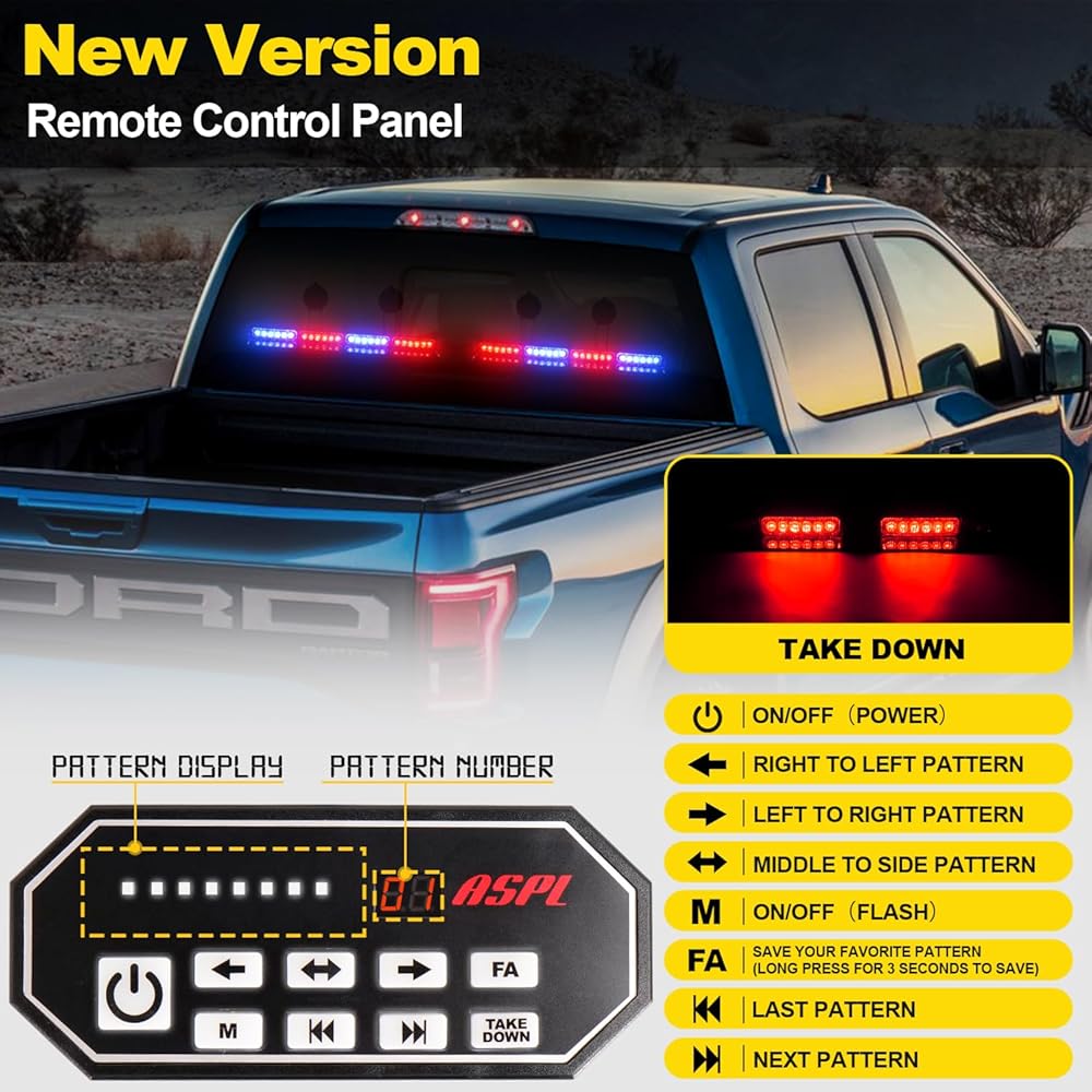 🔥 【لوحة التحكم عن بعد - الأحدث 】 نقوم بترقية وظيفة الضوء. مجهزة بلوحة تحكم مع شاشة عرض، حتى تتمكن من مسح وضع وميض الضوء حتى من مقعد السائق. تحتوي لوحة التحكم على 9 أزرار، بما في ذلك 3 أزرار تحديد سريع لوضع الاتجاه، وزر الوضع المفضل للتخزين، وزر الإزالة.. إجمالي 20 وضعًا للاختيار من بينها وآخر وظيفة ذاكرة النمط المستخدمة.