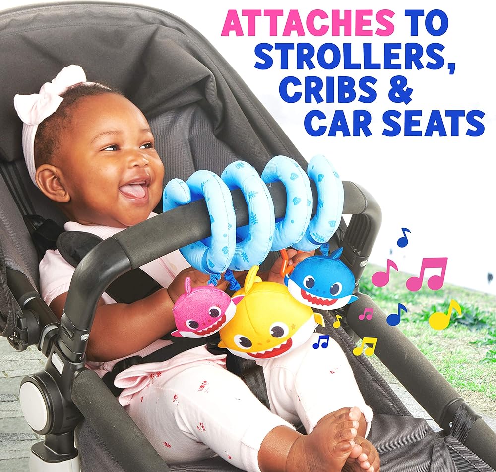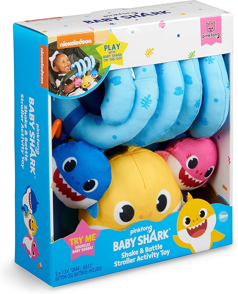 Includes 4 hanging activities: This adorable stroller toy features four ways to play with the famous Shark Family. Shake the Mommy Shark plush for a rattle sound, pat the Daddy Shark plush for silly crinkle sounds, squeeze the Baby Shark plush to hear 4 verses of the official Baby Shark Song (English version), and reach for the hanging star.