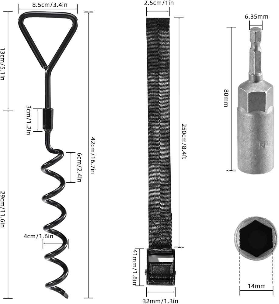 OVERALL DIMENSION: Ground anchor kit/wind stakes length: 16.7in, Width: 3.5in, Diameter: 0.3in(8mm). Nylon straps length: 8.4ft