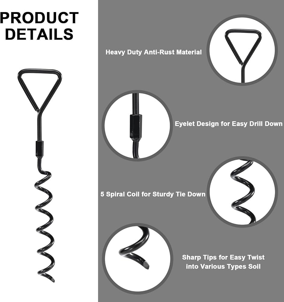 • This tie down stakes can protect your trampolines, swing sets, greenhouse, basketball hoop, sheds, canopies, tents, fences, trees in high wind weather.
