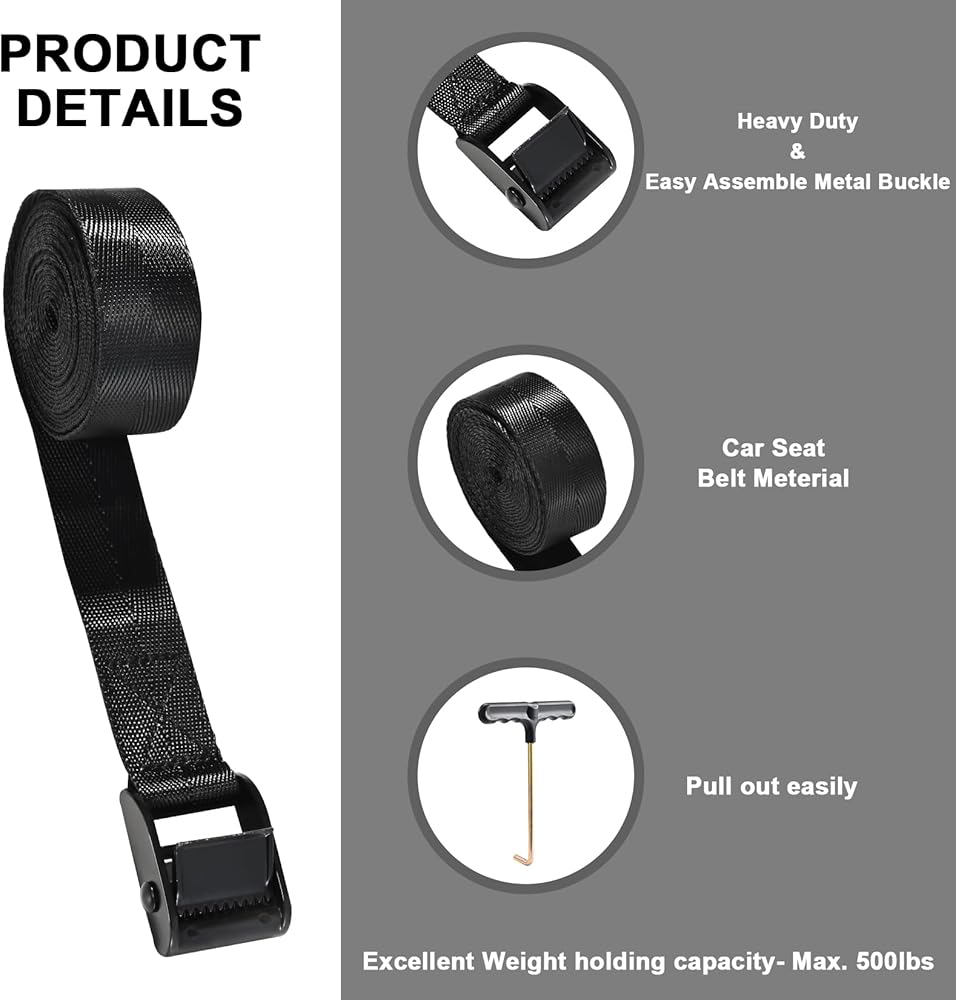 STURDY AND DURABLE: Black coated steel surface and UV-resistant Nylon straps. Securely tightens loads up to about 500lbs force.