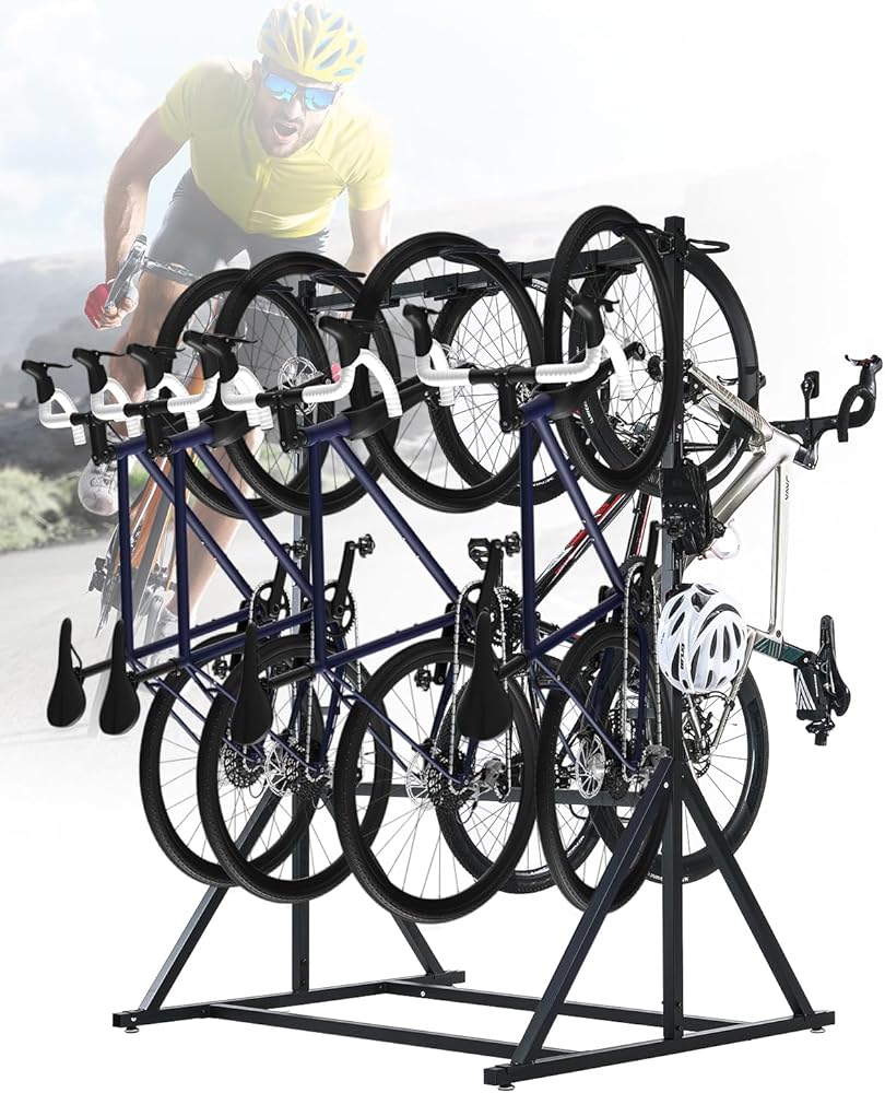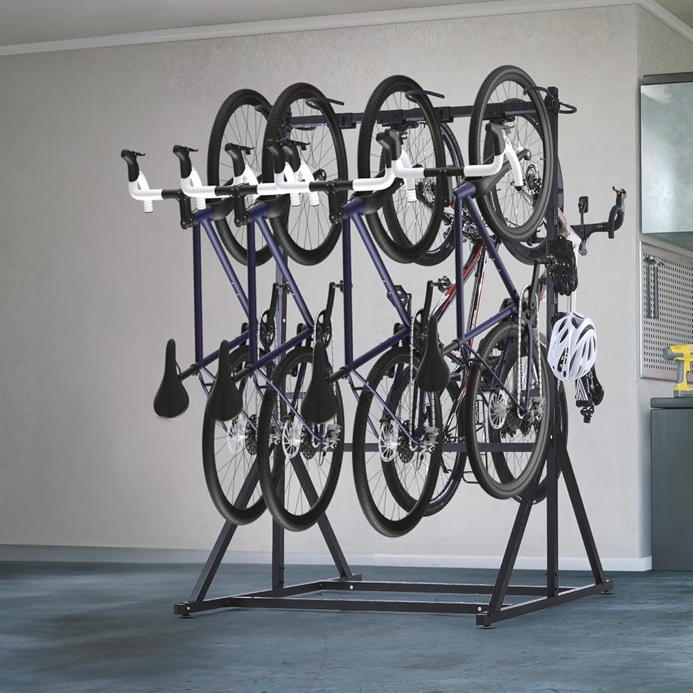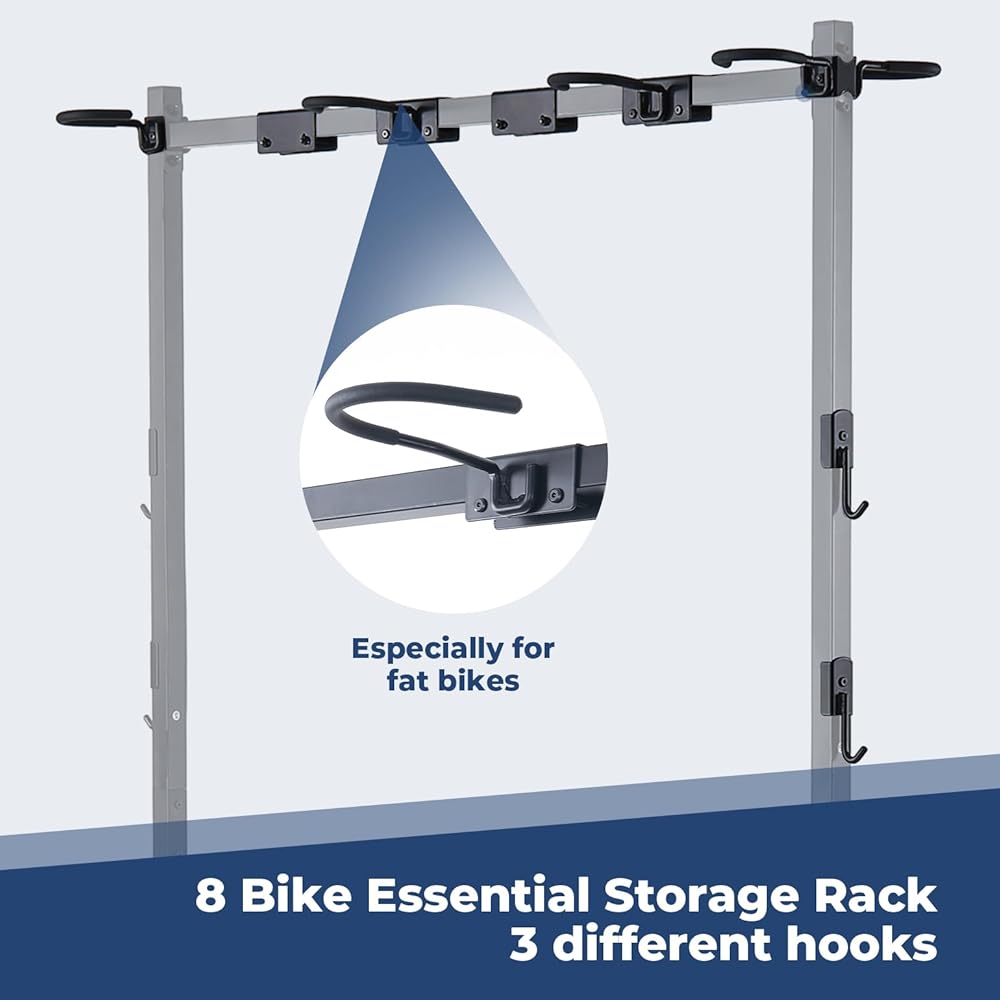 【رف تخزين 8 دراجات قائم بذاته】مجهز بـ 8 خطافات، أكبر خطافين مصممان خصيصًا للدراجات ذات الإطارات الدهنية. مناسبة لدراجات الطرق والدراجات الجبلية والدراجات الإلكترونية والدراجات القابلة للطي ودراجات الأطفال.