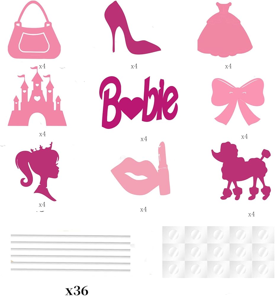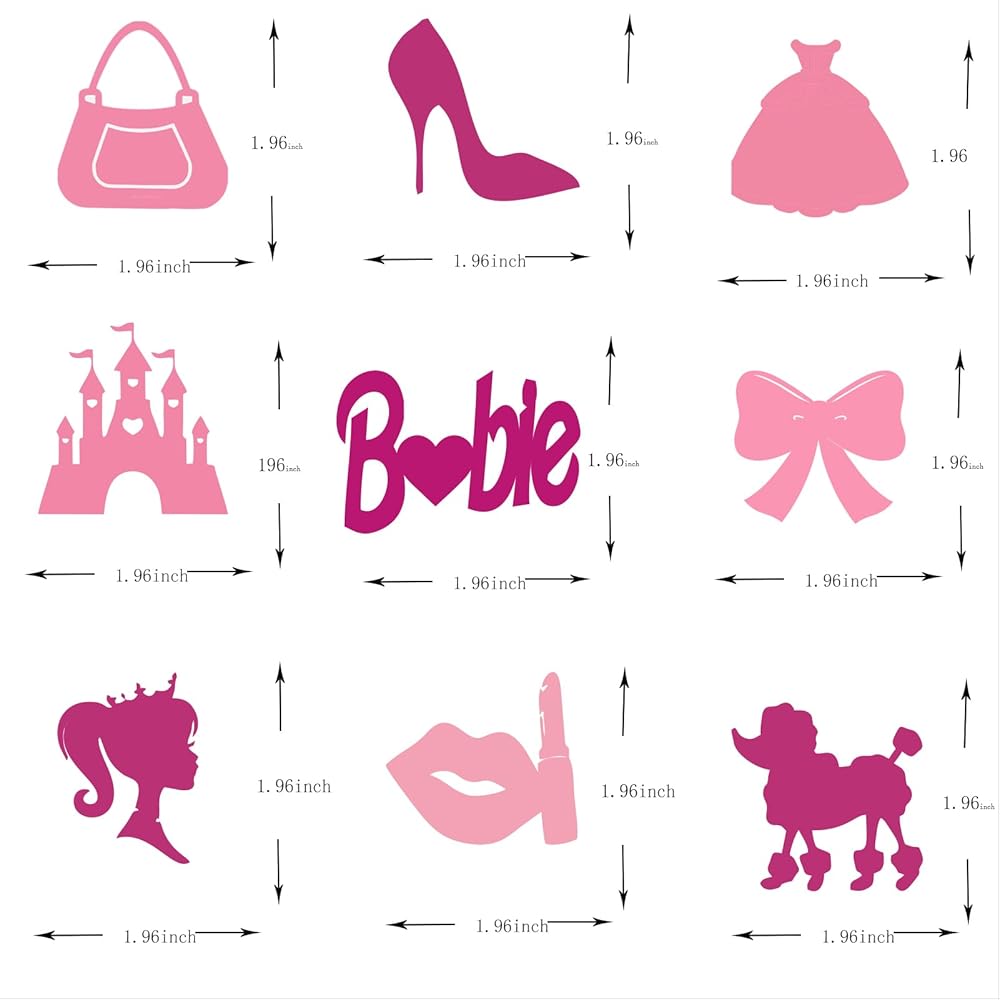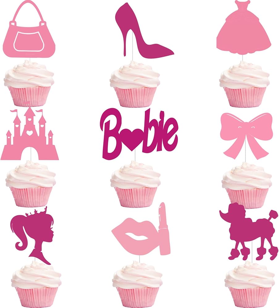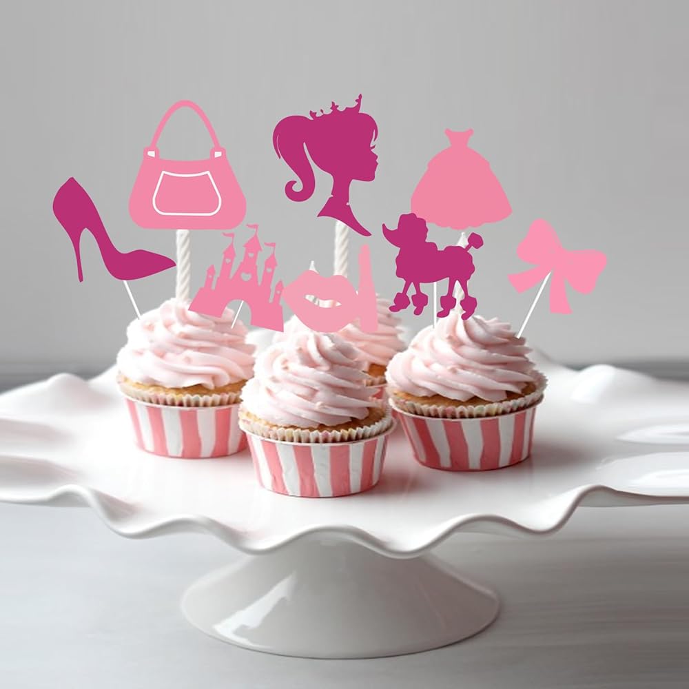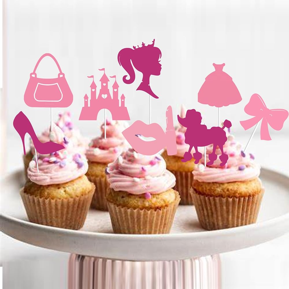 36 قطعة من أغطية الكب كيك لعيد ميلاد سعيد للفتيات باللون الوردي الساخن، فستان وردي لامع للأميرة بكعب عالٍ وقوس أحمر الشفاه على شكل تاج لتزيين الكب كيك وحفلات استقبال المولود الجديد للنساء والفتيات