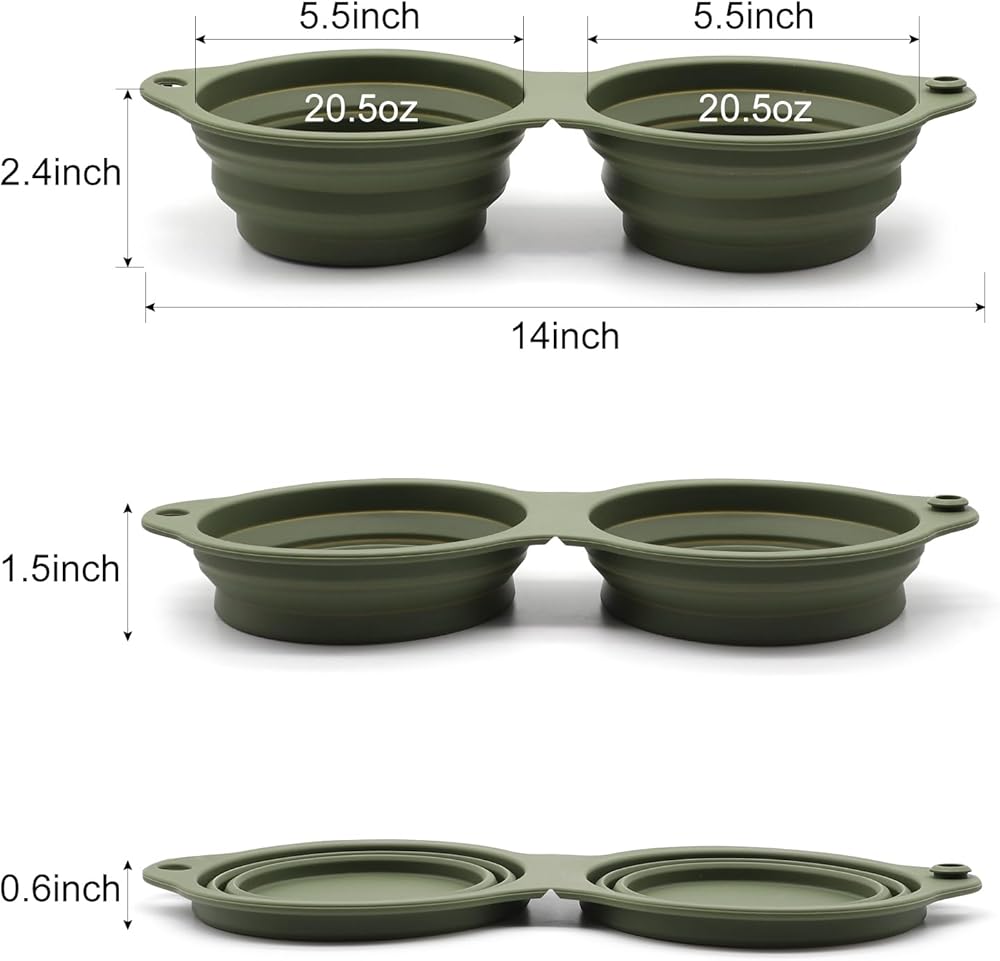 CONVENIENT DOG TRAVEL WATER BOWLS:easy to collapse and clean,compacts nicely and does not take up much space in the travel bag.Each bowl could holds 600mL( 20oz) or 2.5 cups of food or water.Ideal for small to large dogs ,cats as travel feeding bowls/ water dish.