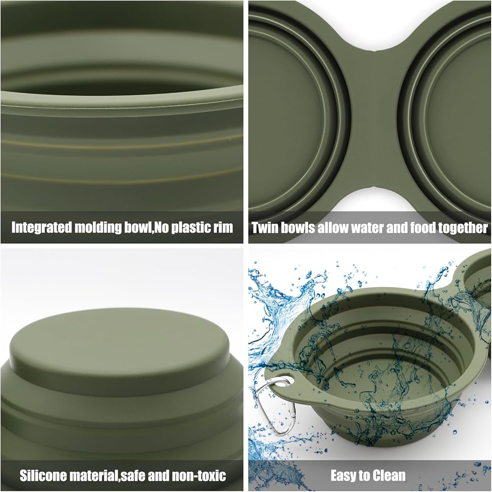 COLLAPSIBLE DOG DUAL BOWLS:very functional collapsible dog dual bowls.It's actually two bowls, which makes this the ultimate portable dog travel bowl as it could give your pooch food and water at the same time when on the trips .