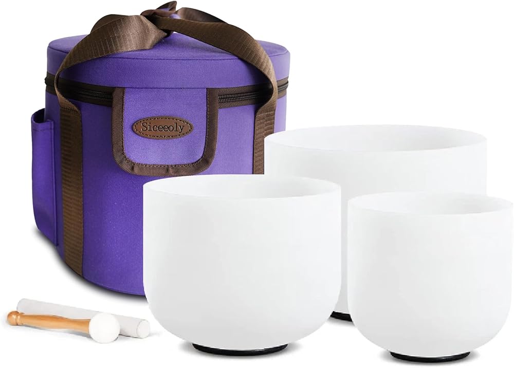 مجموعة Siceeoly مكونة من 3 أوعية للغناء مقاس 8-12 بوصة 8 بوصة B 10 بوصة F 12 بوصة C بلوري شقرا كوارتز أبيض كريستالي لمعالجة الصوت مع 1 حقيبة حمل للسفر 1 مطرقة من جلد الغزال 1 مهاجم 3 حلقات دائرية