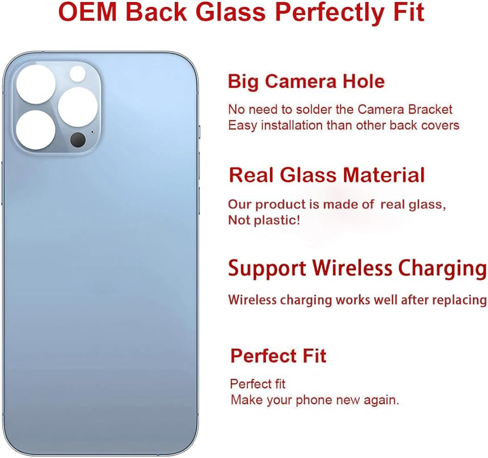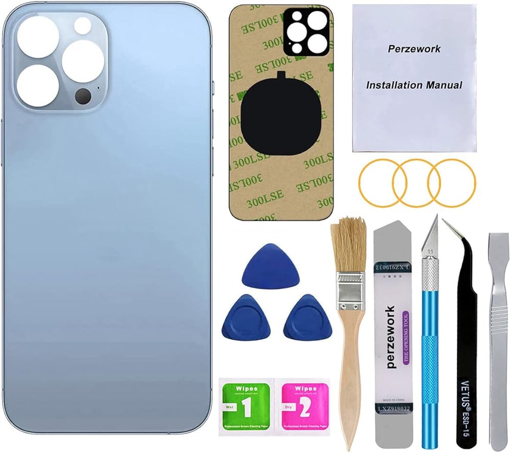 استبدال الزجاج الخلفي الخلفي من شركة Perzework OEM متوافق مع iPhone 13 pro max 6.7 بوصة جميع الحاملات مع أدوات لاصقة مثبتة مسبقًا وأدوات إصلاح احترافية (أزرق)