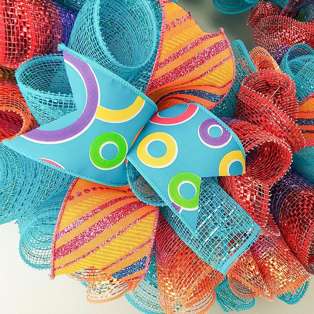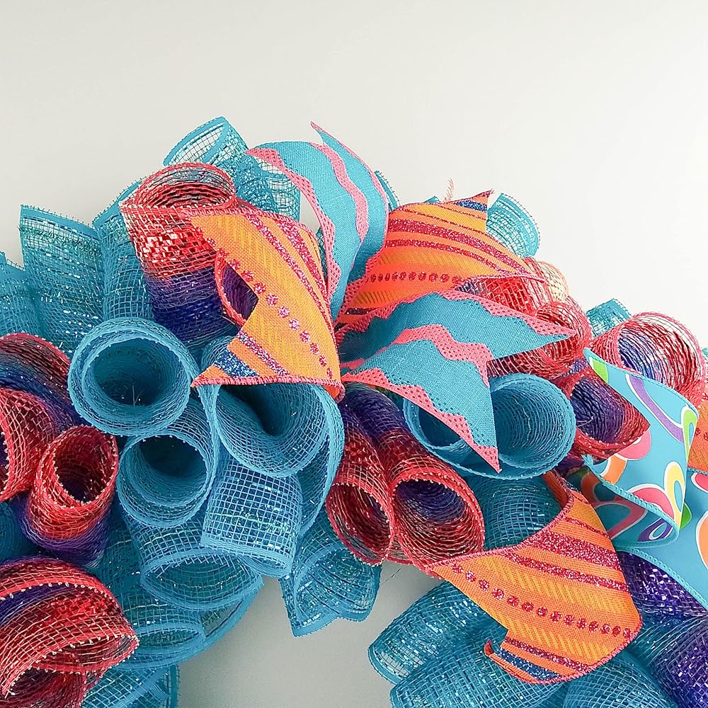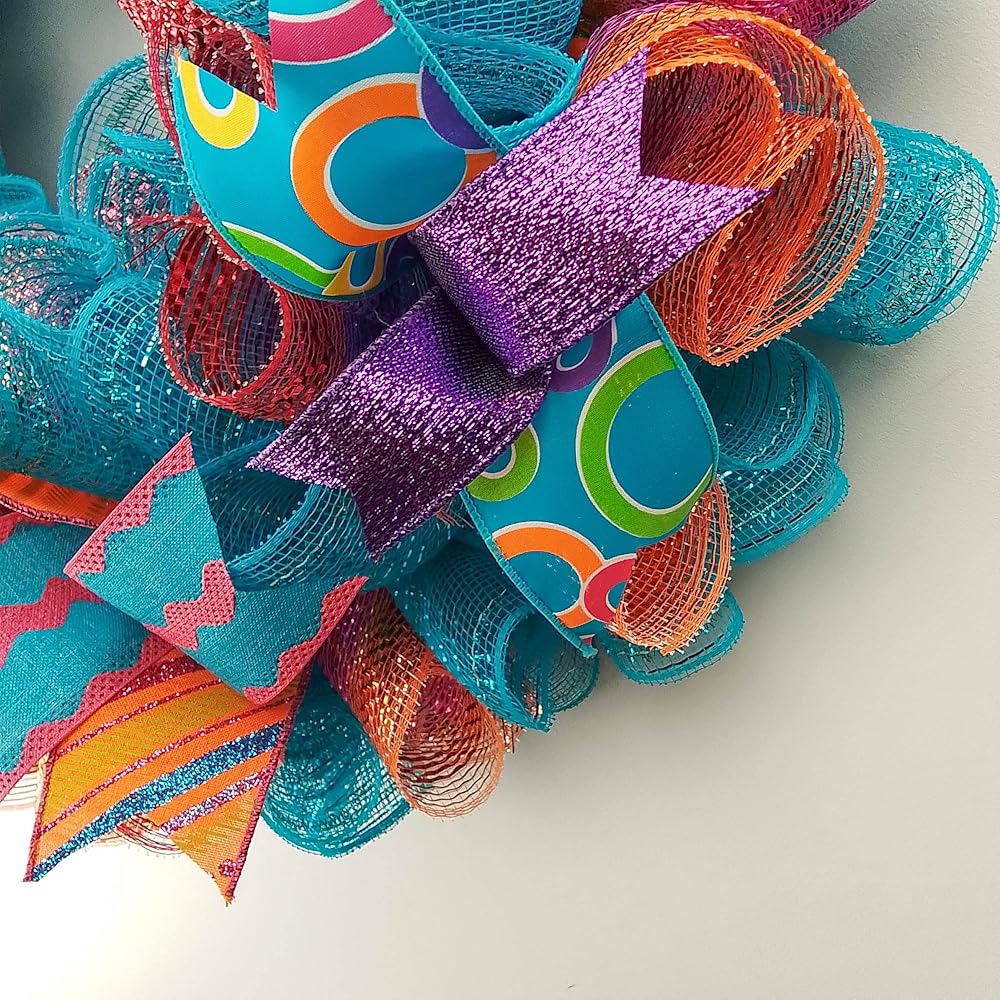 This ready to ship wreath is made with orange, turquoise and white mesh and accented with several different colors of ribbons