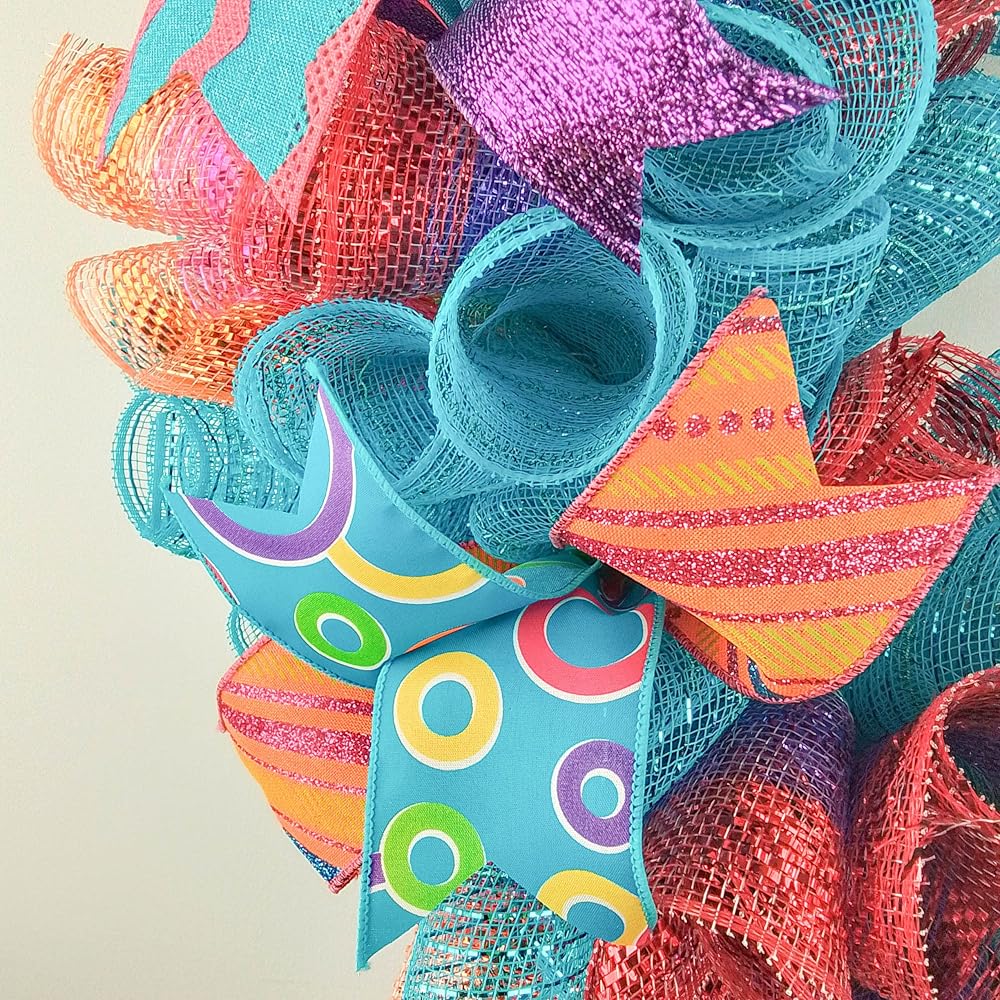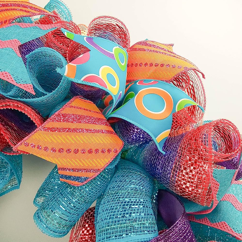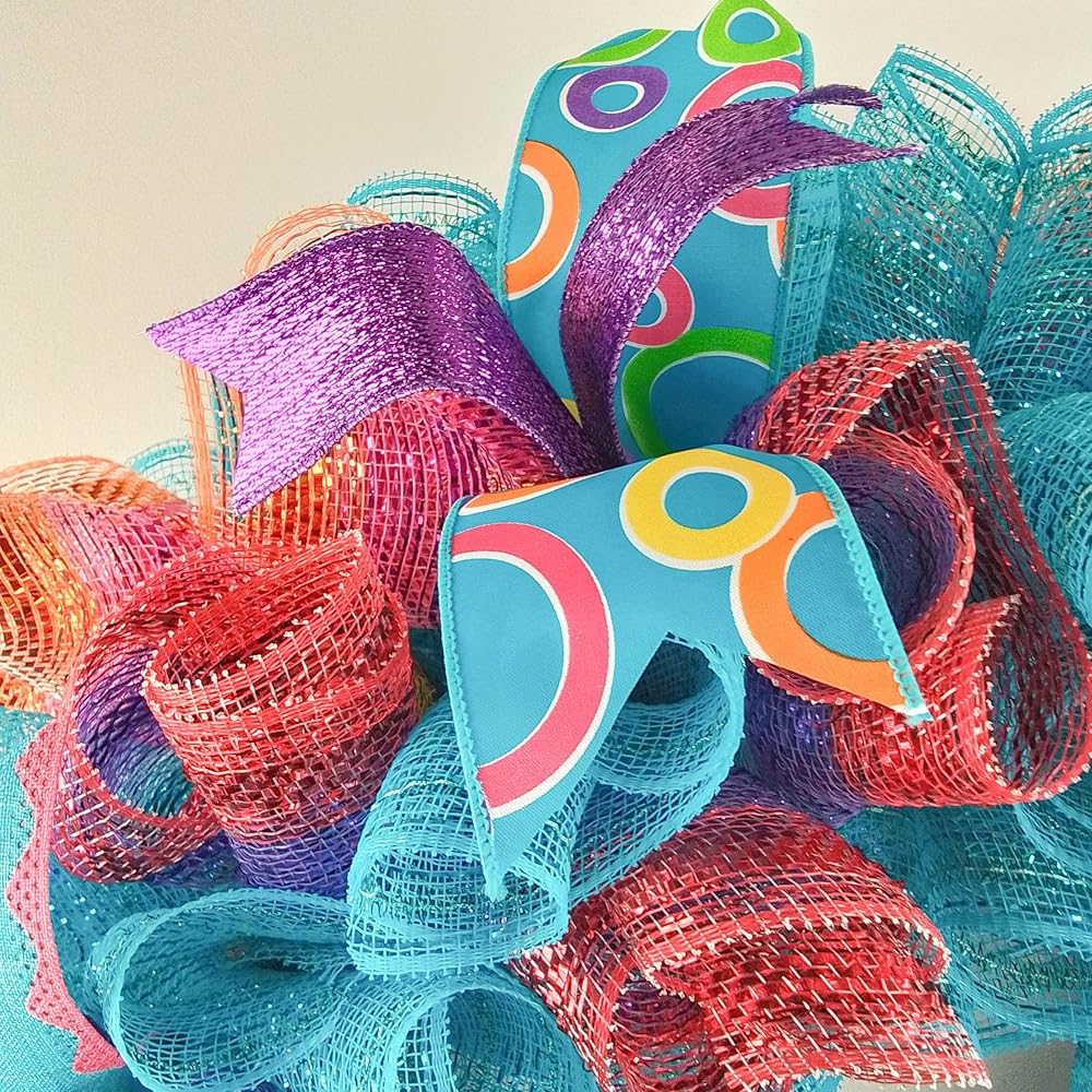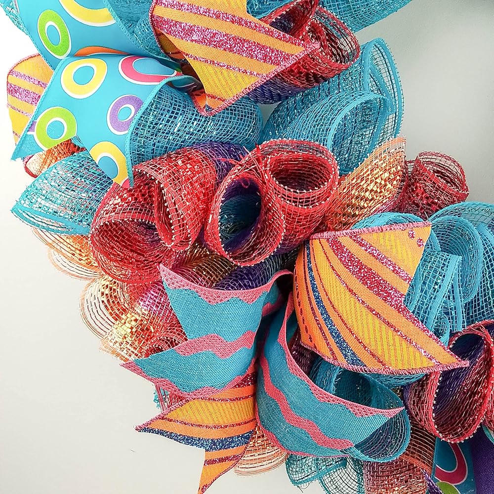 This ready to ship wreath is made with orange, turquoise and white mesh and accented with several different colors of ribbons