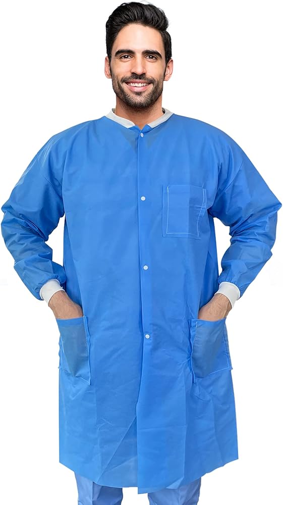 • ثوب طبي أزرق للاستعمال مرة واحدة كبير 40 جرامًا للمتر المربع: معاطف مختبرية للاستعمال مرة واحدة للبالغين للاستخدام في البيئات الخاضعة للرقابة والعديد من مجالات التطبيق العامة. معطف المختبر الرجالي مثالي للتنظيف والرسم والمزيد. الكمية: 10 قطع في كل علبة.