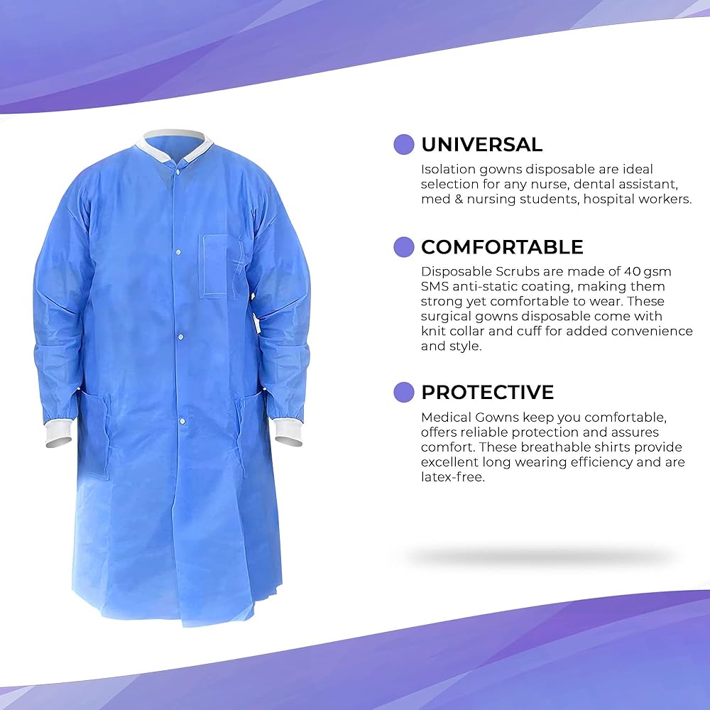 AMZ Medical Supply معاطف مختبر للاستعمال مرة واحدة للبالغين، مقاس كبير، عبوة من 10 معاطف مختبرية للرسائل النصية القصيرة، ملابس طبية للاستعمال مرة واحدة مقاومة للسوائل 40 جرامًا في المتر المربع مع أزرار كبس أمامية، وياقة وأصفاد محبوكة، 3 جيوب