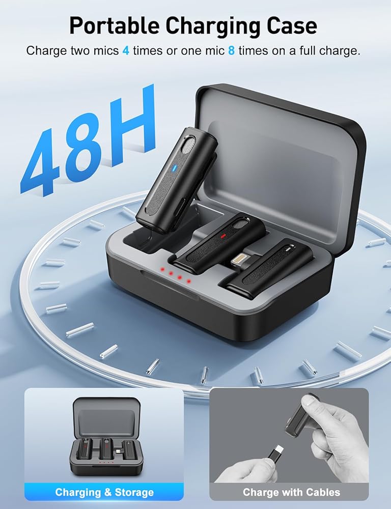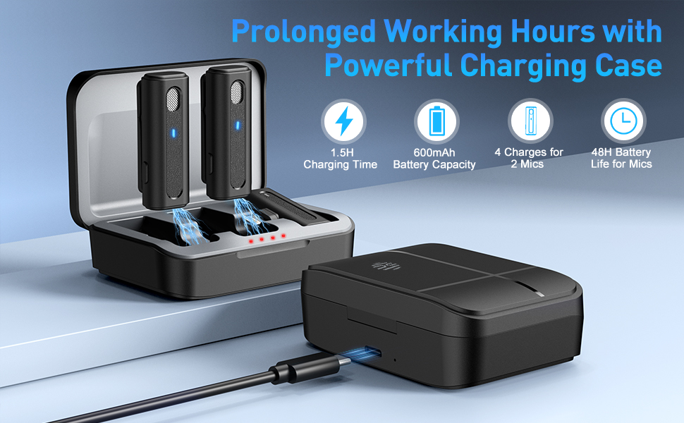 وقت شحن أقل، ومدة أطول - تم تجهيز الميكروفونات الصغيرة المُحدثة ببطاريات قوية للحفاظ على عمل كل ميكروفون بشكل مستمر لمدة 5 ساعات. تستغرق علبة الشحن الخاصة بهم 90 دقيقة فقط للحصول على شحن كامل، حيث يتم شحن ميكروفونين 4 مرات أو ميكروفون واحد 8 مرات. قم بتمديد ساعات العمل حتى 48 ساعة إجمالاً (عند استخدام ميكروفون واحد فقط).