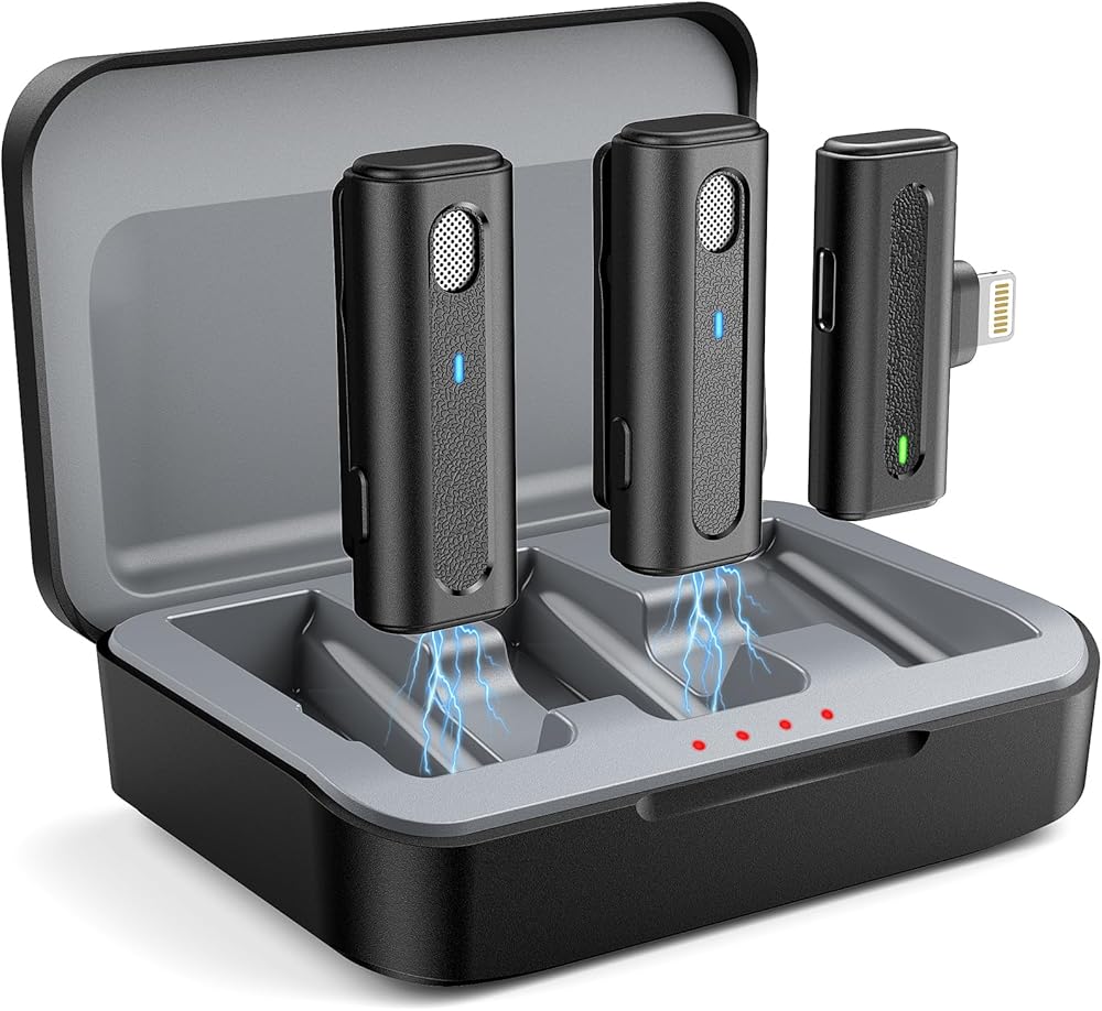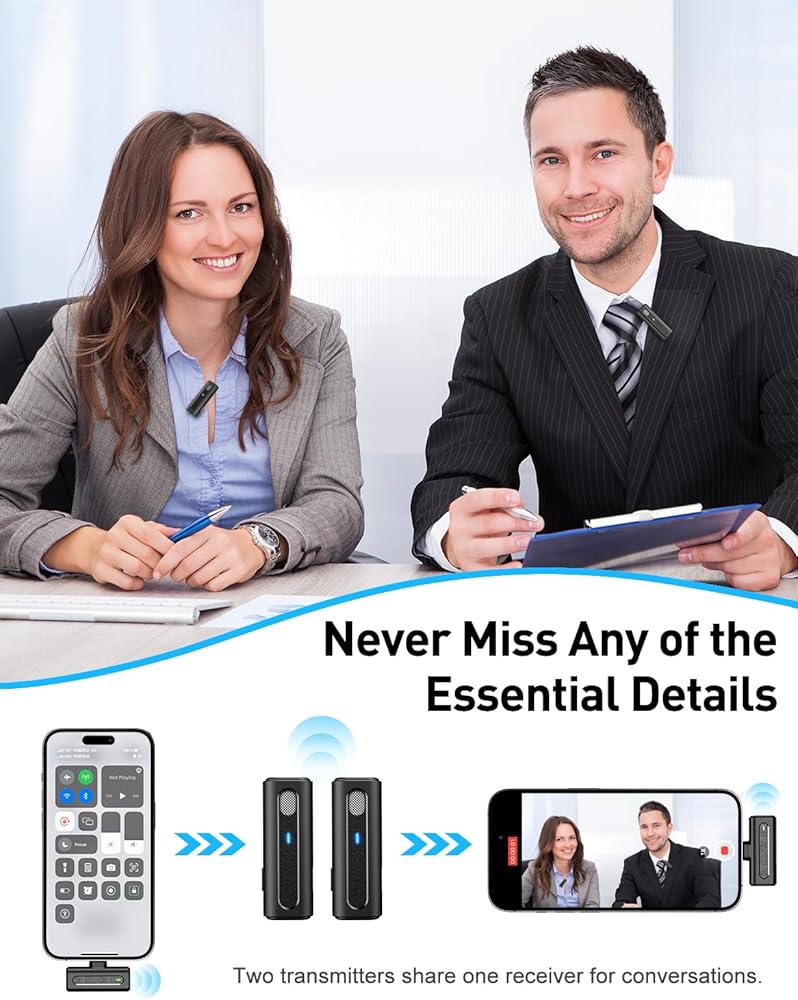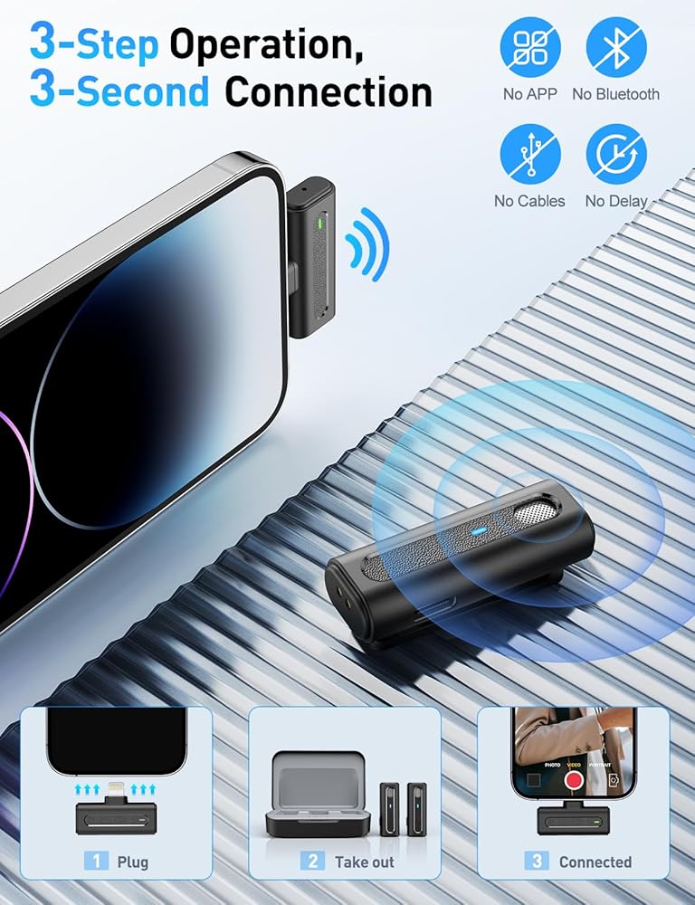 ميكروفون لاسلكي مزدوج لجهاز iPhone - يعمل هذا الميكروفون اللاسلكي على التوصيل والتشغيل بدون تطبيقات أو اتصال Bluetooth. يتصل الميكروفون الصغير بجهاز الاستقبال تلقائيًا، ويحقق الاقتران بزر واحد تسجيلًا خاليًا من المتاعب.