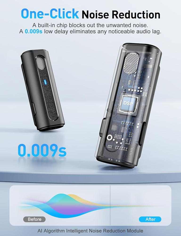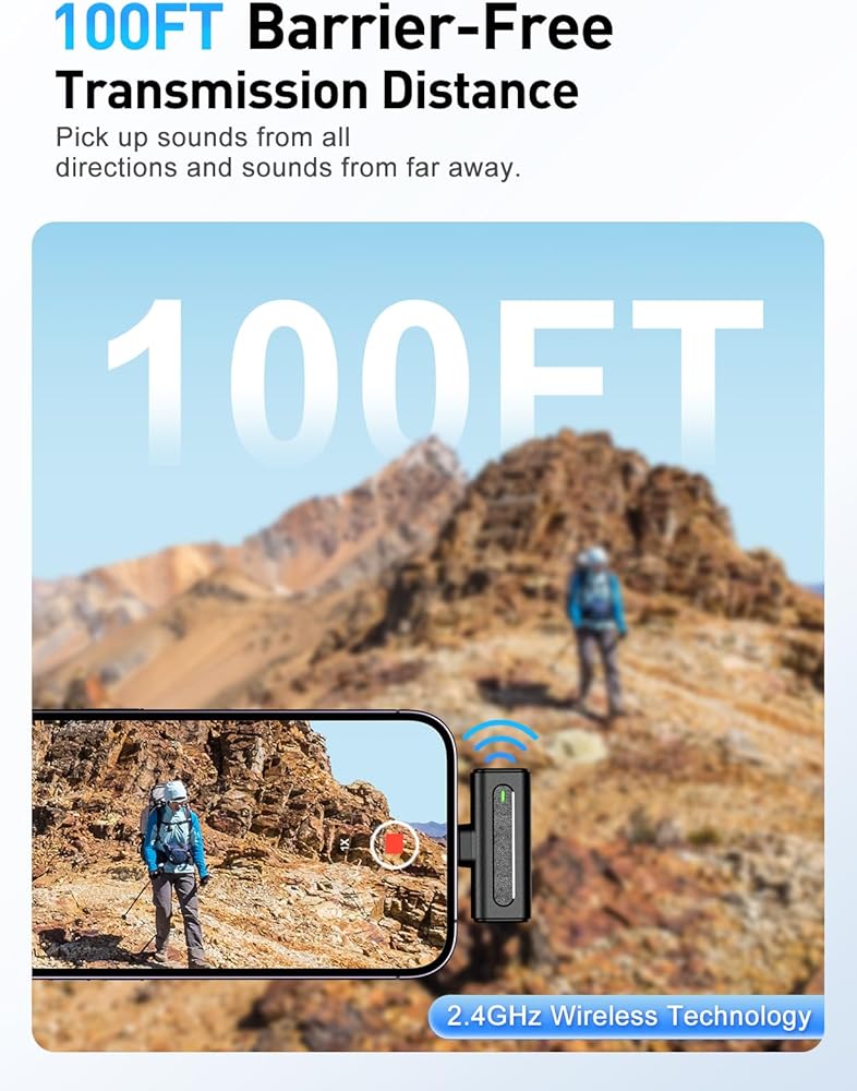 نقل ثابت لمسافات طويلة - مسافة نقل خالية من العوائق تبلغ 30 مترًا/100 قدم تمنحك المزيد من الحرية في التحرك أثناء التسجيل. مع تقليل زمن الوصول إلى 0.009 ثانية، يسمح الميكروفون الصغير لجهاز iPhone للصوت بمتابعة الفيديو. يعد الميكروفون الصغير مثاليًا لـ Youtube/Vlogging/Facebook/TikTok/البث المباشر/المقابلات/الاجتماعات.