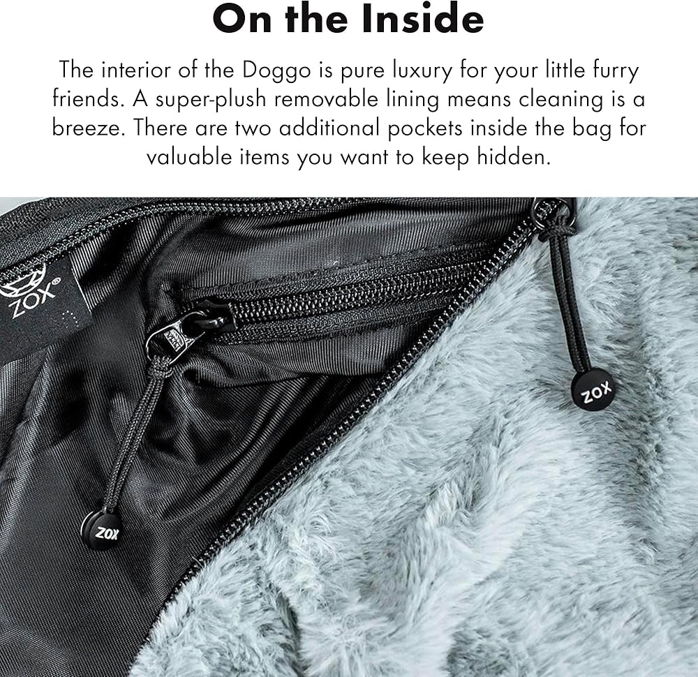 MAXIMUM COMFORT. The Doggo is meant to fit just about everyone without adjustments. A wide shoulder strap helps evenly distribute your dog's weight and the luxuriously plush lining is removable — making cleaning a breeze.