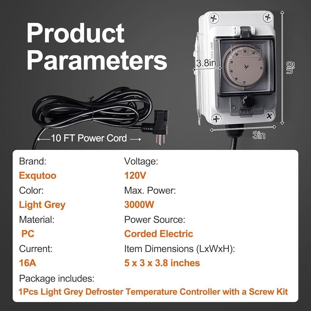 【Product Parameters】: Brand: Exqutoo Color: Light Grey Material: PC Current: 16A Voltage: 120V Max. Power: 3000W Power Source: Corded Electric Item Dimensions (LxWxH): 5 x 3 x 3.8 inches Package includes: 1Pcs Light Grey Defroster Temperature Controller with a Screw Kit
