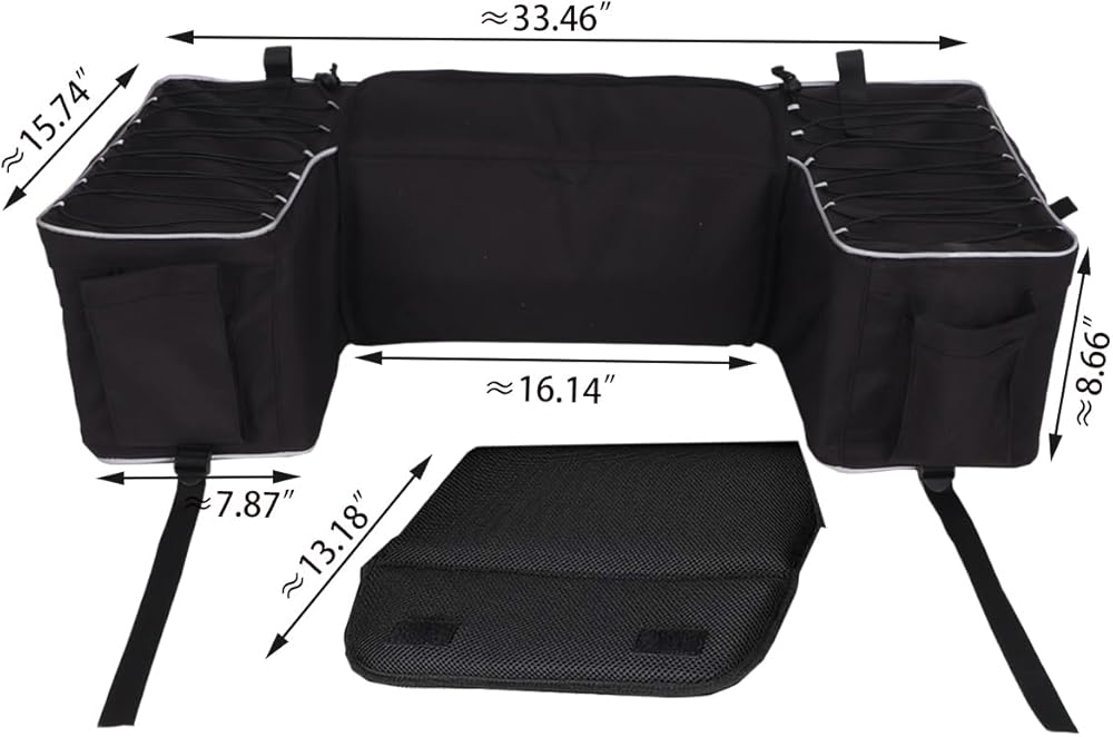 Large Storage Space with overall dimensions of 33.5" x 15.7" x 8.7", 2x outside pockets allow you to store drinks or some personal items. Please measure your ATV seat, for example, the length of our ATV seat bag is 33.5 ".