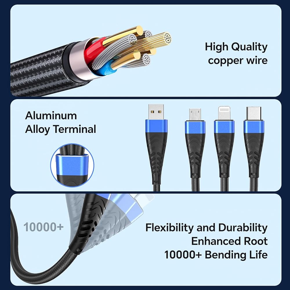 The multi charger cable is made of nylon braided material, and high-quality heat-resistant aluminum alloy terminals are used at the interface to improve the reliability and durability of the cable.