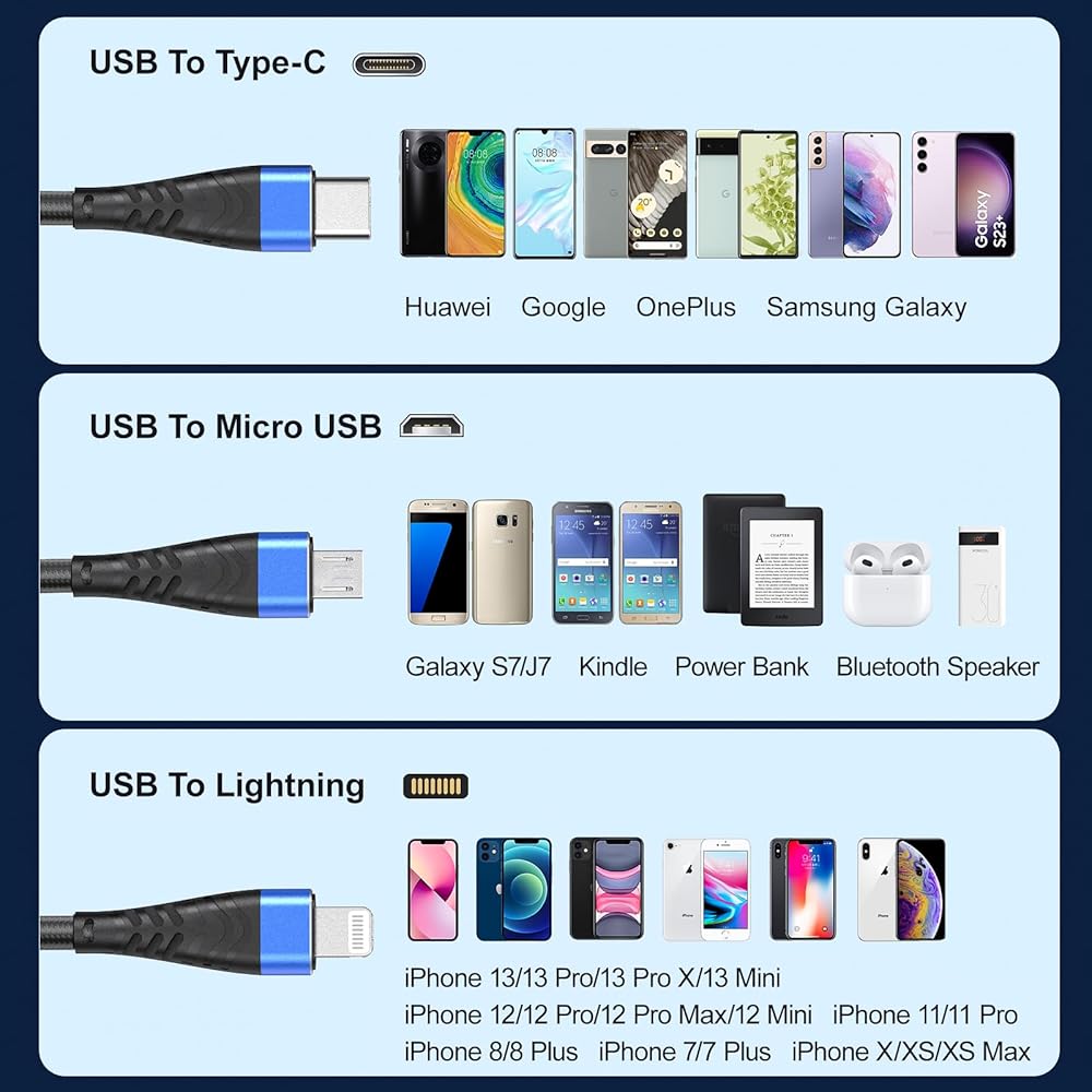 Wide Compatibility : 3 in 1 Charging Cables for Multiple Devices