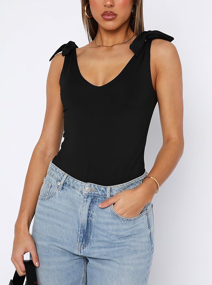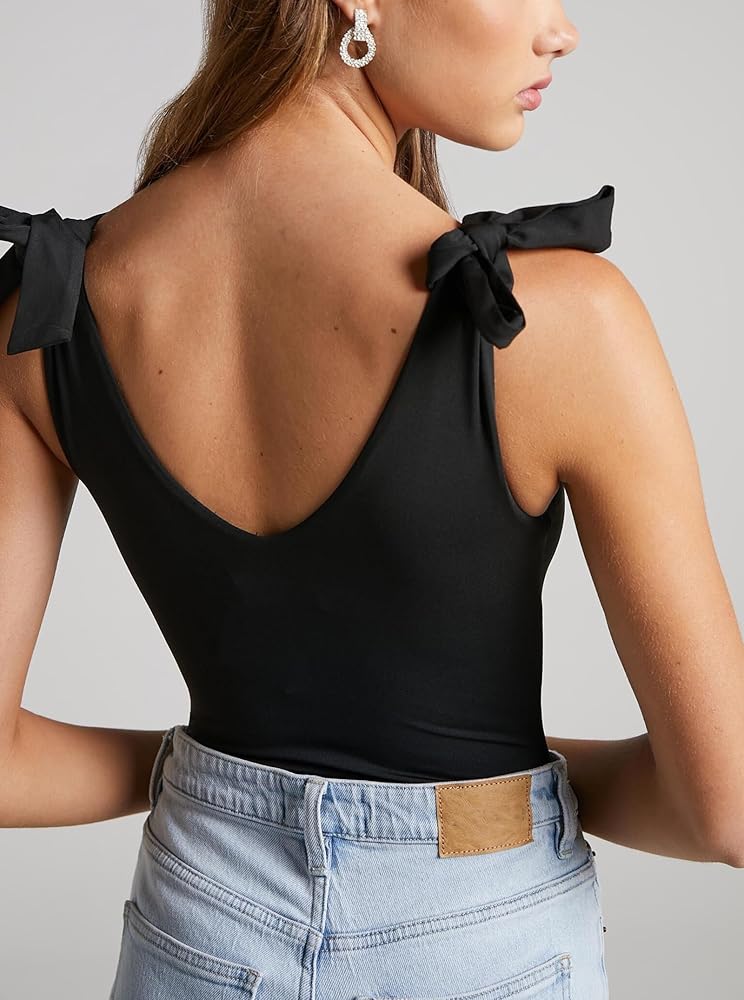 Features - V neck, tie shoulder tank tops, sleeveless tank bodysuit, cute bodysuits top for women