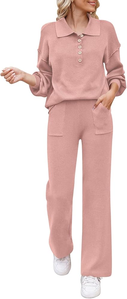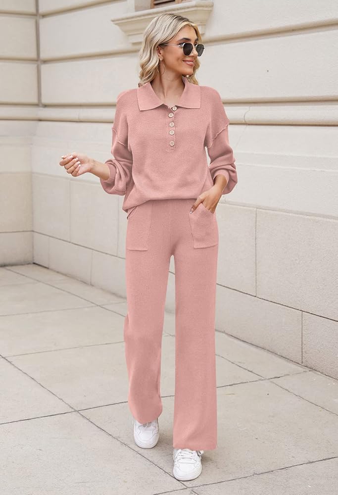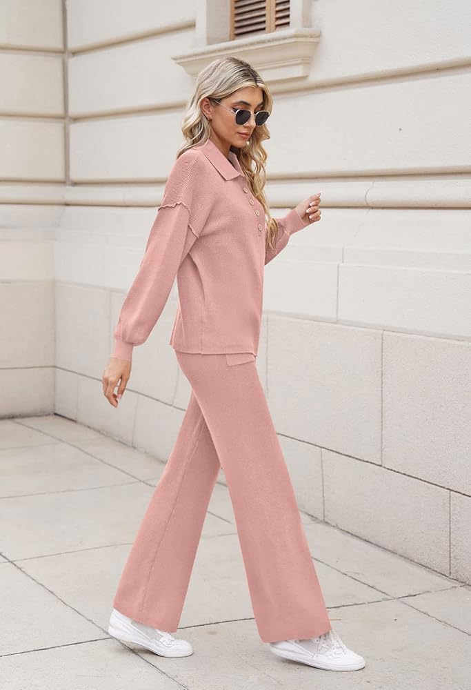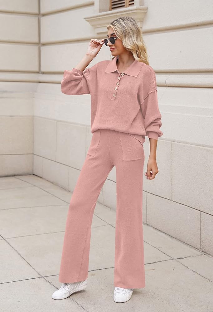 - طقم صالة نسائي من قطعتين منسوج مضلع مترهل، قمصان علوية متماسكة بأزرار وبنطلون طويل بأرجل واسعة