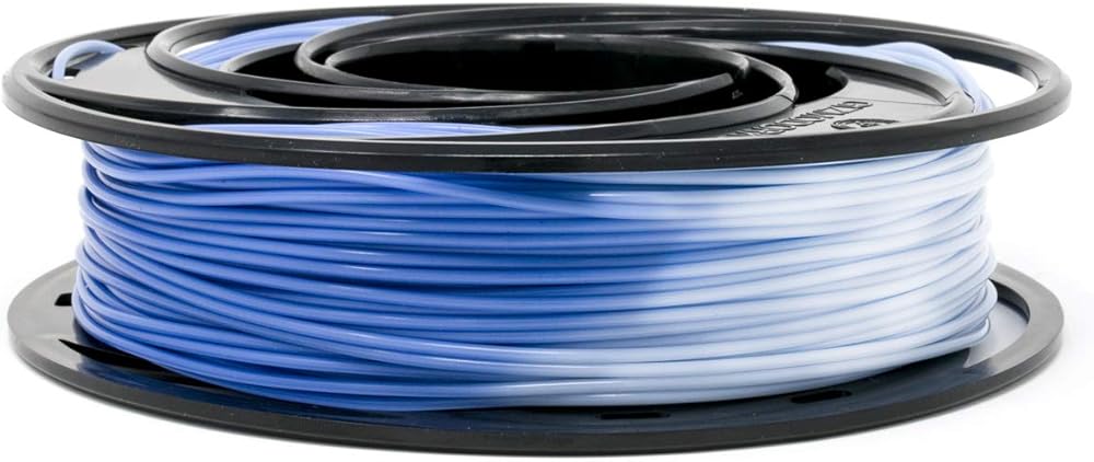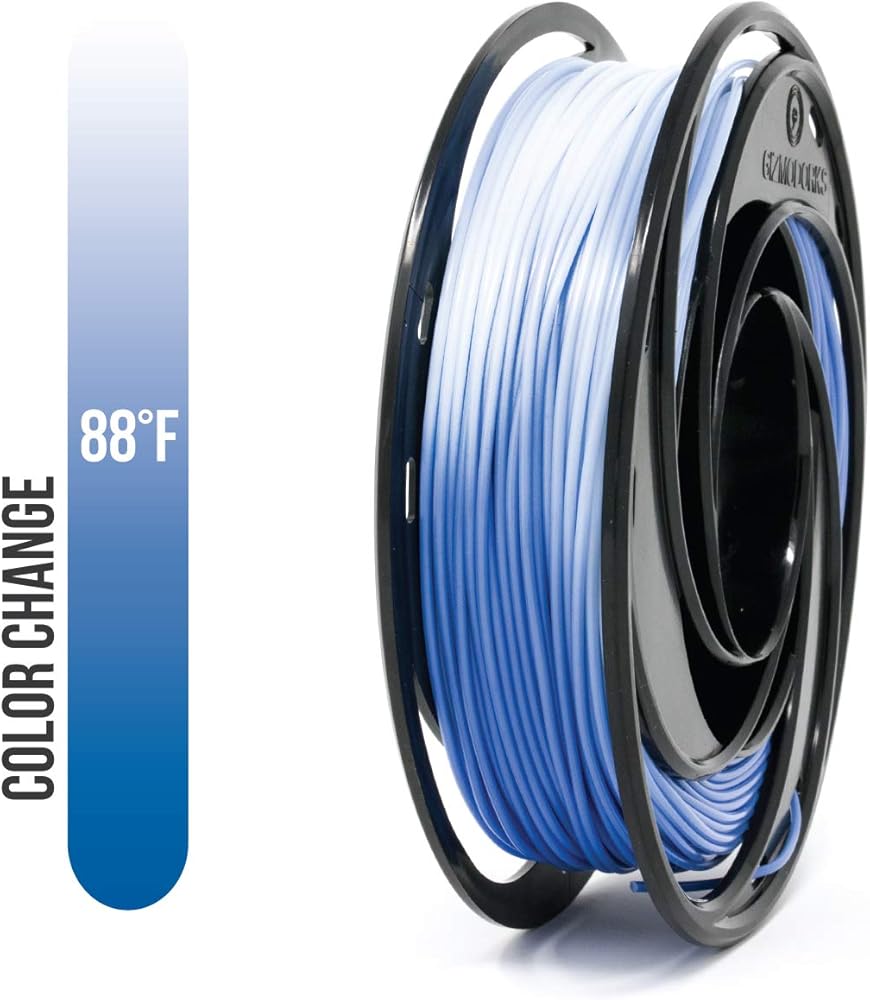 Color changing filament is a special filament formulation that changes color when heat is applied. When the temperature of the plastic rises above approximately 88 F, the filament will change to another color. This also means that the plastic will change colors simply by touch such as when holding it in your hand. When the temperature drops down below 88 F, the filament changes back to it's default color.