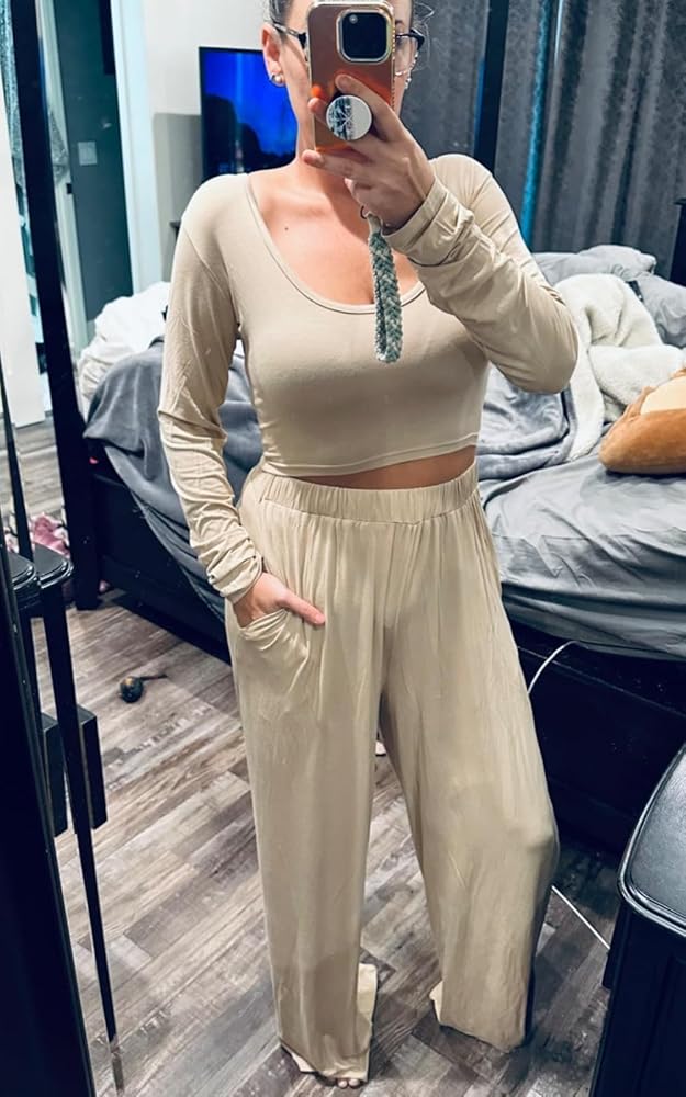 【بنطلون بأرجل واسعة】طقم مكون من قطعتين بأرجل واسعة يحتوي على شريط مطاطي عند الخصر لملاءمة مريحة. قم بترقية أسلوبك مع بنطال بالازو عالي الخصر مع جيبين جانبيين. يجب أن يكون في خزانة الملابس الخاصة بك.