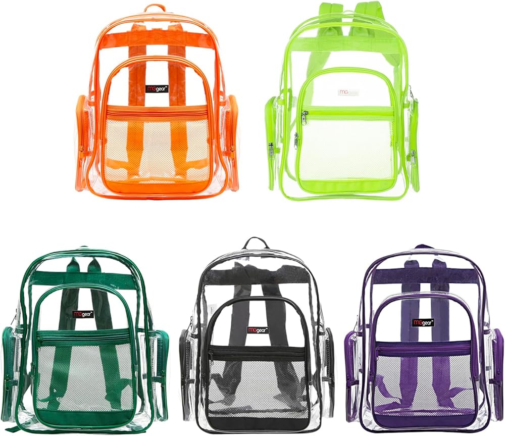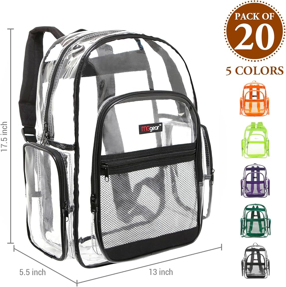 حقائب ظهر من MGgear بالجملة مكونة من 20 قطعة من مادة PVC الشفافة بخمسة ألوان متنوعة - أسود، برتقالي، أرجواني، أخضر، وأصفر، حقيبة ظهر شفافة مقاس 17 بوصة معتمدة من المدرسة، حقيبة نهارية، حقيبة استاد، حقيبة كتب