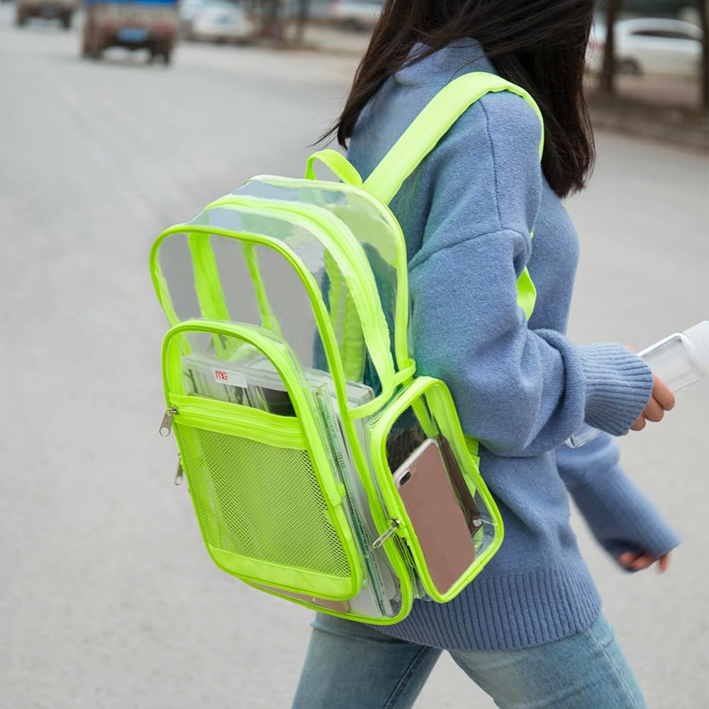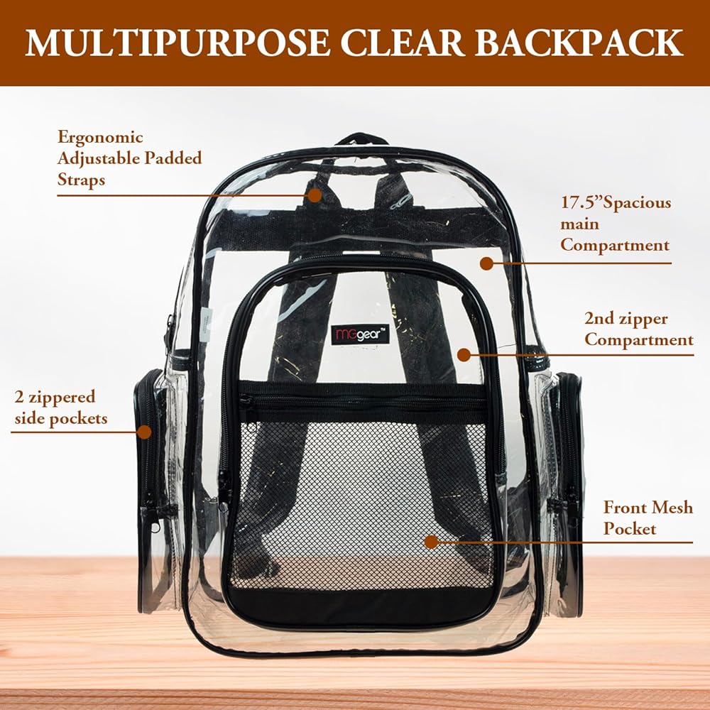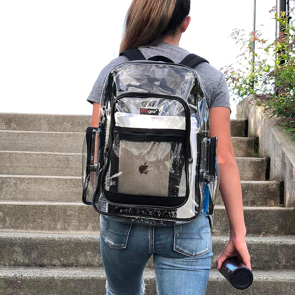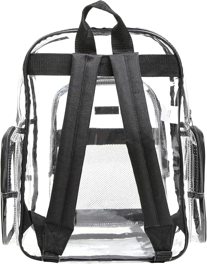 • Each 17-by-13-inch clear PVC backpack features a dual-zippered large capacity main storage compartment and 4 smaller accessory pockets
