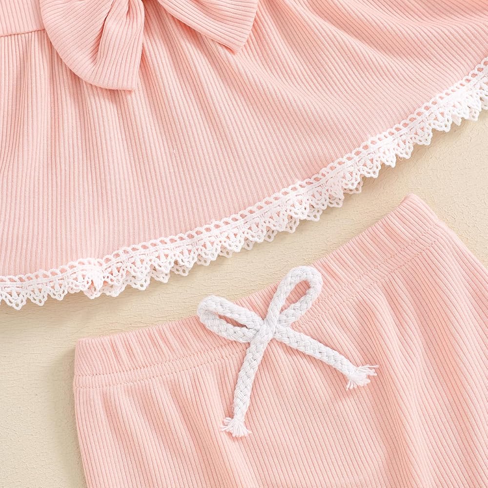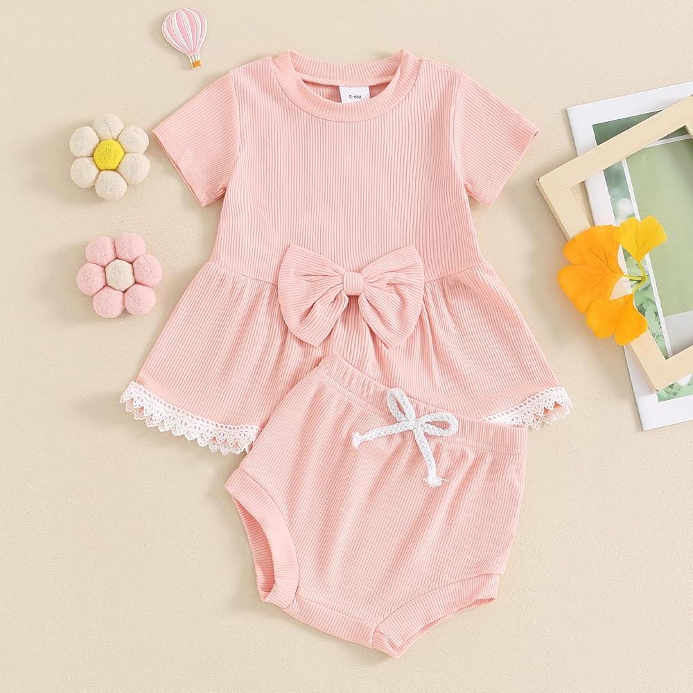 التصميم: ملابس أطفال للفتيات، مجموعة سراويل قصيرة للفتيات الصغيرات، ملابس صيفية للفتيات حديثي الولادة، لون ثابت، رقبة دائرية، زخرفة من الدانتيل، ديكو عقدة على شكل فيونكة، قمصان علوية بأكمام قصيرة للفتيات الصغيرات، تتماشى مع السراويل القصيرة ذات الخصر المرن، ملابس لطيفة للفتيات حديثي الولادة فستان للفتيات، مجموعة سروال للفتيات الصغيرات، تصميم أنيق، يجعل طفلتك أكثر روعة وسحرًا مثل الأميرة!