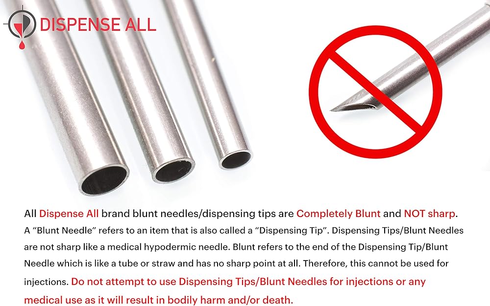 Please note: This product is not a medical product and cannot be used as such. This product is designed for industrial and household use only. A blunt tipped dispensing needle is not sharp or sterile. “Blunt” refers to the tip of the dispensing needle, which is shaped like a tube or straw and has no sharp point. Do not attempt to use this product for any medical uses, as it will result in bodily harm and/or death.