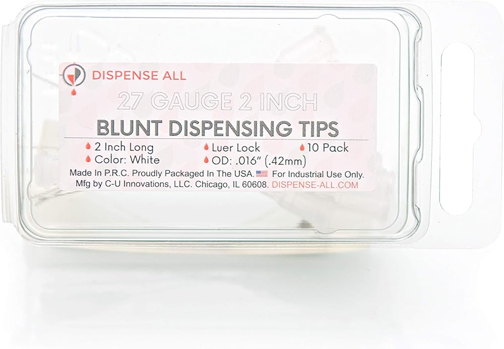This Dispense All product features hollow 2 inch (5.08cm) needles with blunted tips. Each needle is equipped with a standard luer lock hub and is made of high quality, durable materials designed for an easy and reliable dispensing experience. This product may be used for refilling, measuring, and dispensing glues, caulks, paints, vape juice, essential oils, inks, and much more. Ideal for science experiments, arts & crafts, sealants, and small parts and area cleaning. With competitive pricing compared to other dispensing brands, Dispense All doesn't compromise on quality, guaranteeing users excellent precision and control for almost any dispensing project.