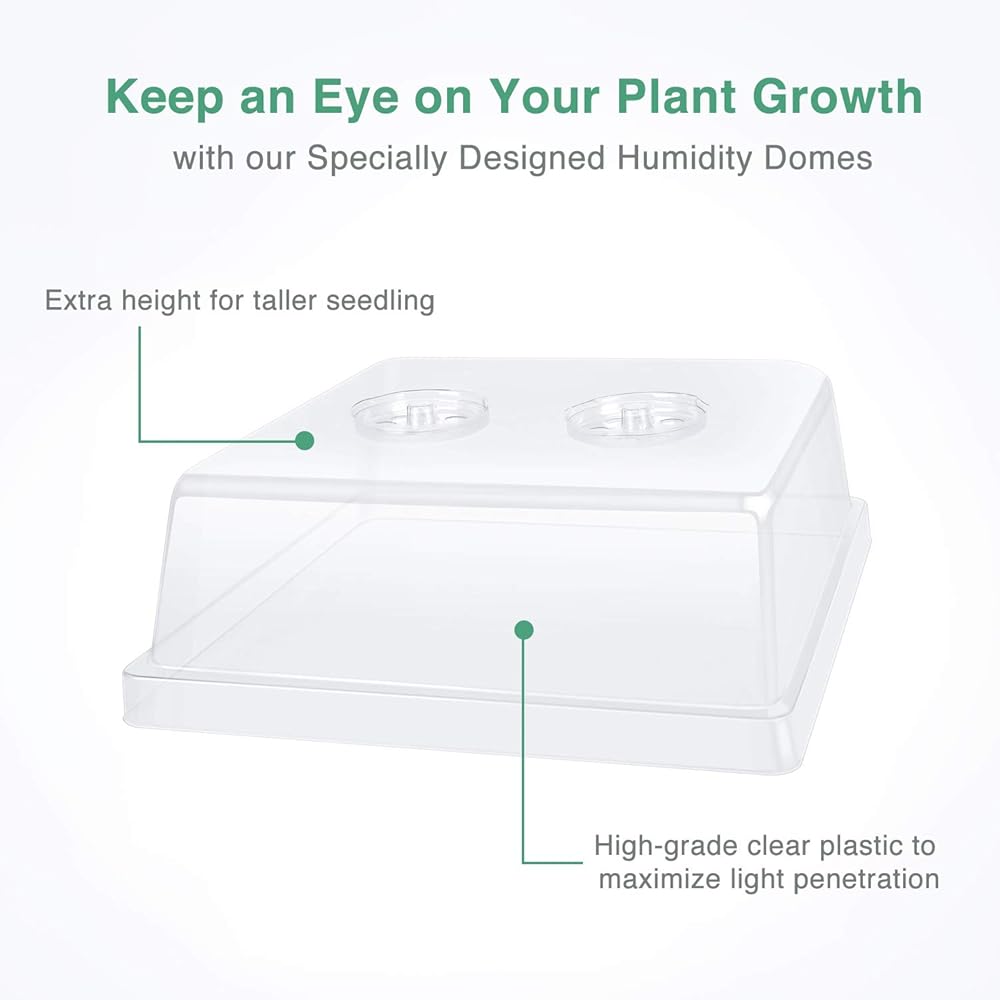 تحكم ممتاز في الرطوبة: قببتنا الشفافة عالية الارتفاع لها فتحتين دائريتين قابلتين للتعديل مصممتين في الجزء العلوي لتوفير تحكم سلس في تدفق الهواء، وأقصى اختراق للإضاءة، وأفضل زاوية رؤية لنباتاتك. حجم صينية البذور 42.44 سم × 27.78 سم × 6.01 سم، قببة الرطوبة 17 بوصة × 11.36 سم × 13.02 سم، والحجم الكلي 42.4 سم × 10.94 سم × 18.74 سم.