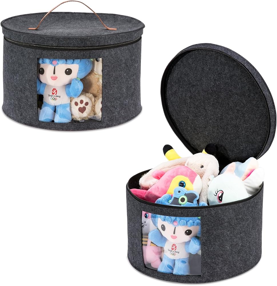 Round Large Storage Box -The hat storage box is 17'' D and 10'' H, means they are deep and large enough to store more than one stuffed animal toys. And the round organizer bag can protect your toys from getting dusty while keeping order in closet