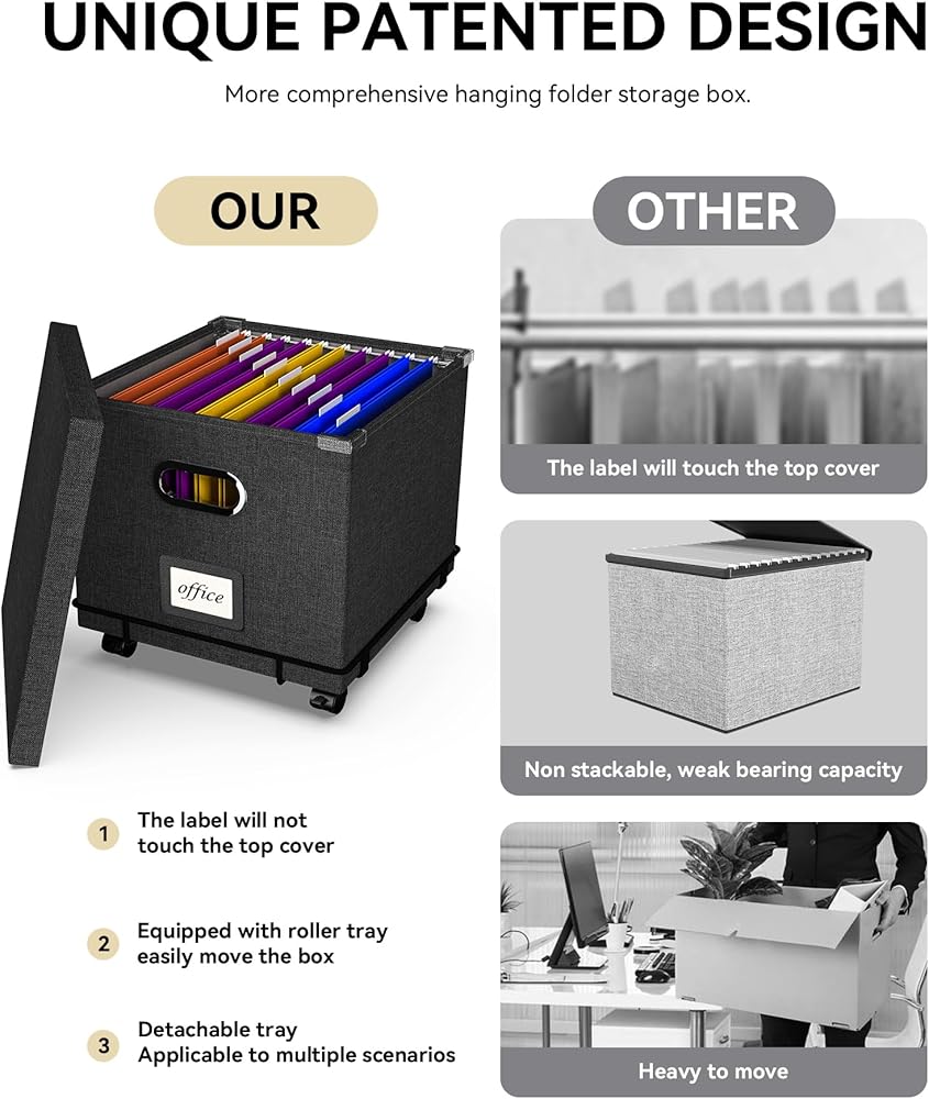 [ترقية جديدة]: مع دعامة دعم المجلدات المعلقة حديثًا، لن يلمس الملصق الغطاء العلوي عند إغلاق صندوق الملفات. كما أنها مجهزة بدرج دوار لسهولة الحركة. نحن نهتم بتجربة كل عميل وقمنا بترقية صندوق الملفات من أجل راحتك.