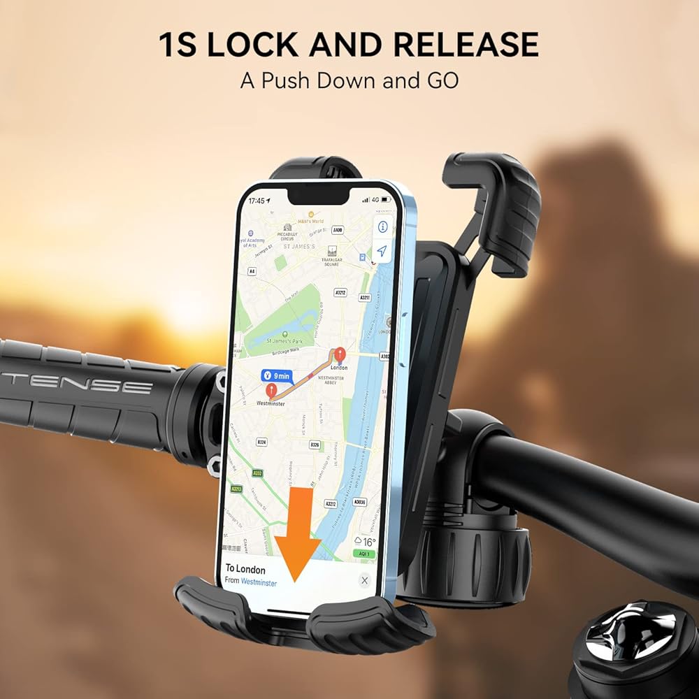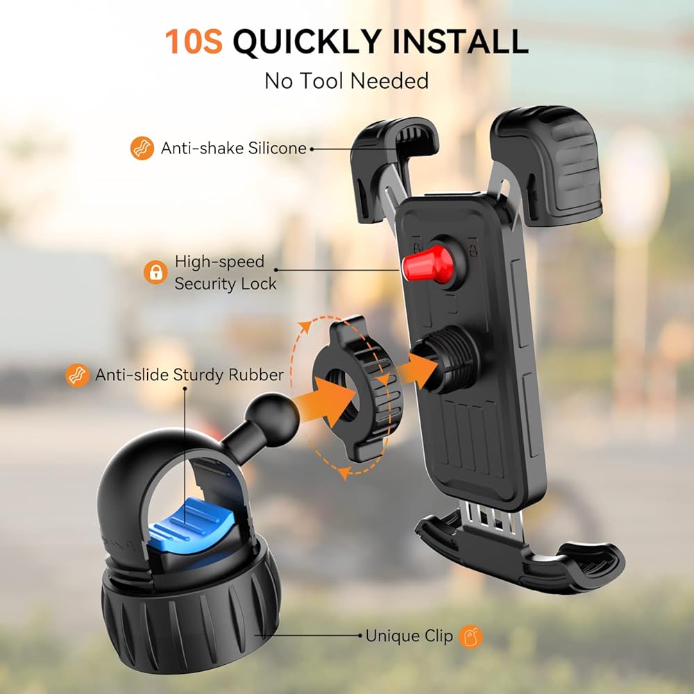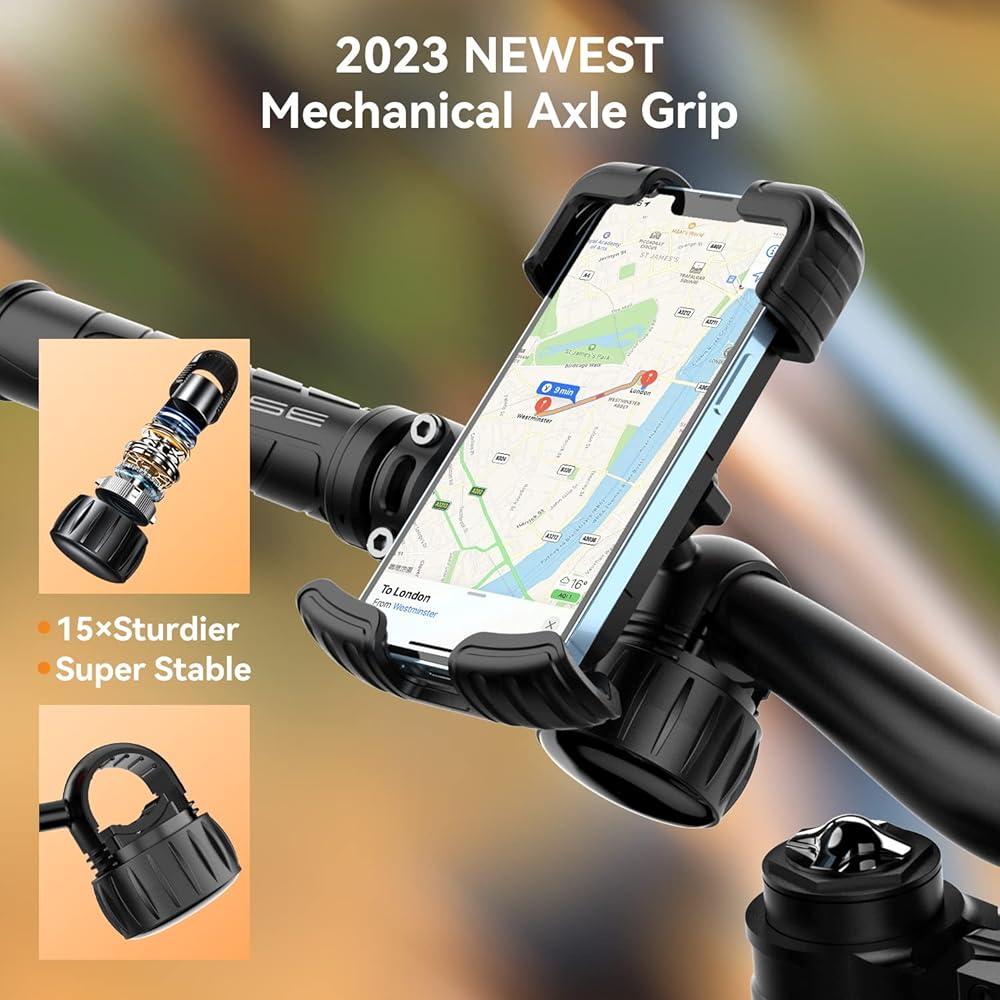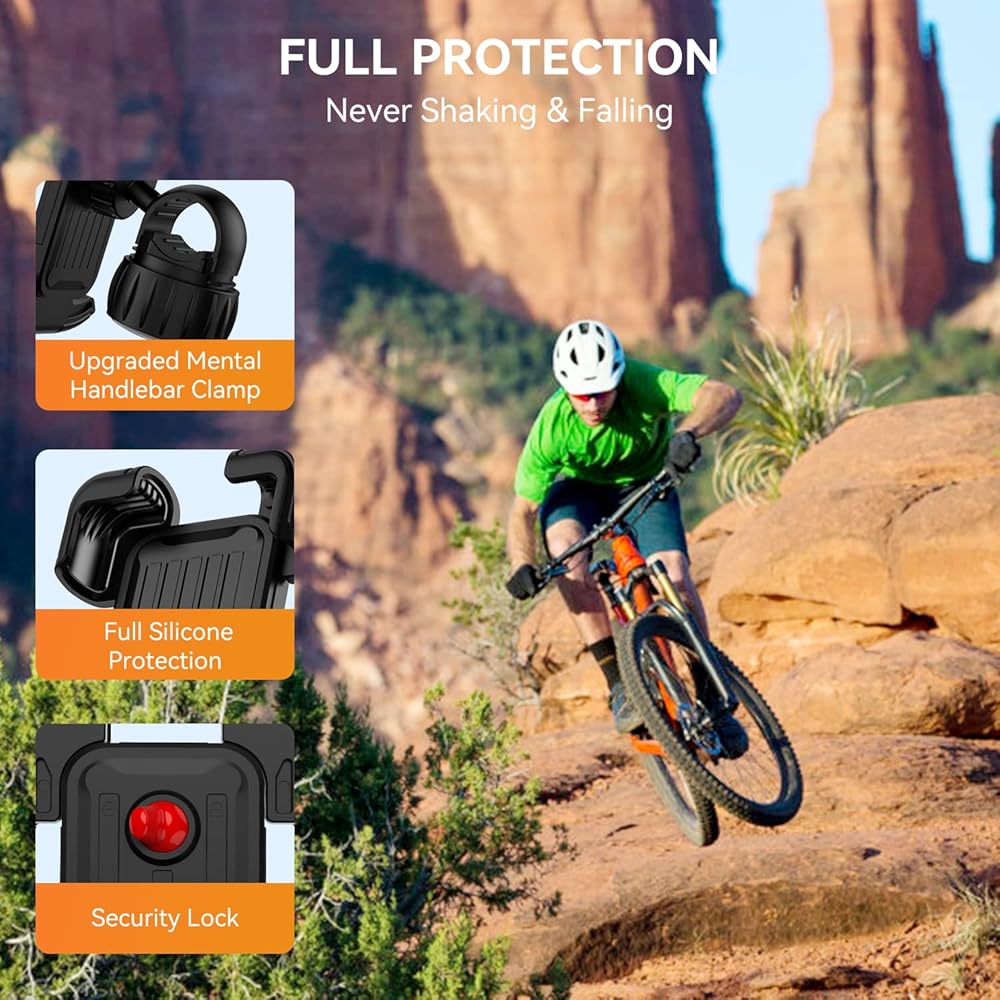 أحدث قبضة للمحور الميكانيكي ولا تسقط أبدًا - يعتمد حامل هاتف الدراجة الجبلية المحدث هذا على أحدث مشبك المحور الميكانيكي، فهو يوفر أقوى قوة قبضة لتثبيت المقود بإحكام على الصدمات، ويمتص الاهتزاز من الدراجة النارية والطرق الوعرة أثناء ركوب الدراجة، وسوف احتفظ بهاتفك في حالة مستقرة للغاية حتى عند السرعات العالية. بطانة من السيليكون المضاد للخدش، لا تزيد فقط من قوة الإمساك على الصدمات، ولكن أيضًا تحمي طلاء المقود الخاص بك من الخدش.