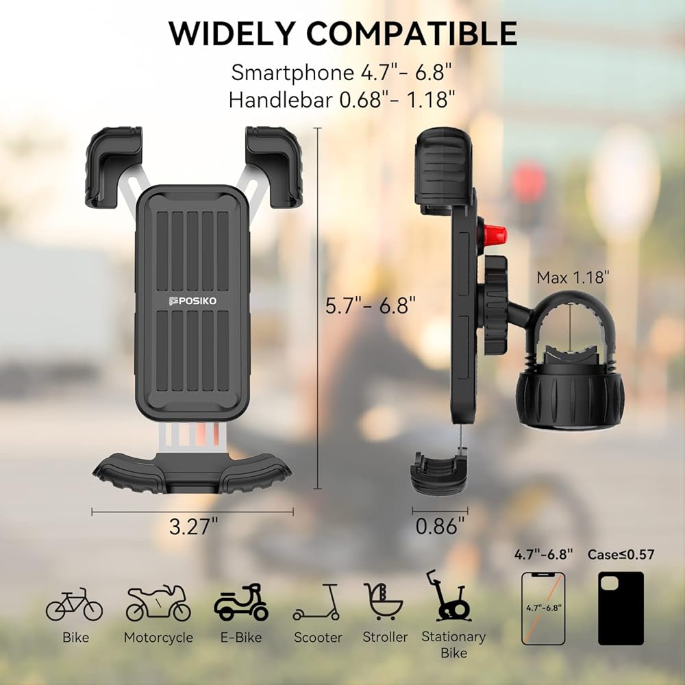 حامل هاتف دراجة نارية متوافق على نطاق واسع - حامل/حامل هاتف خلوي عالمي للدراجة النارية يمكن أن يناسب هواتف iPhone وAndroid مقاس 4.7 بوصة - 6.8 بوصة مع حافظات سميكة (السُمك ≥0.59 بوصة)، مثل iPhone 14 /13/ 12 Pro Max وPro وiPhone 14 Plus، iPhone Xs، iPhone XR، X،8 Plus 7 6s 6، Galaxy S10 + S10e S9 S8، Note 9، LG والمزيد. يناسب قطر المقود 17.5-30 ملم (0.68-1.18 بوصة). مناسبة لأنواع مختلفة من الدراجات، مثل الدراجة، والدراجة النارية، وعربة الأطفال، وعربة التسوق، والسكوتر الكهربائي، والدراجة الداخلية، وجهاز المشي.