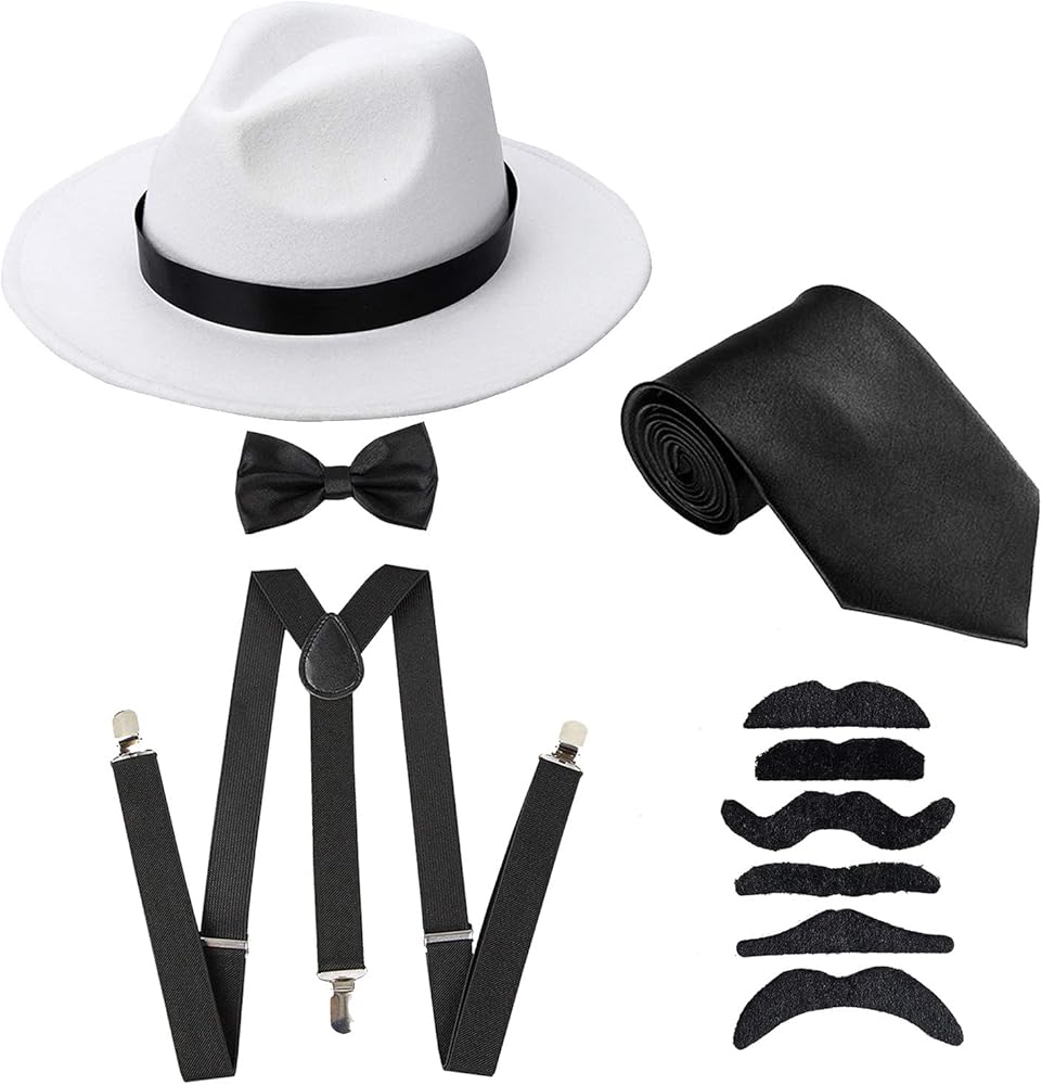 مجموعة قبعة مانهاتن فيدورا من عشرينيات القرن العشرين للرجال، وحمالات على شكل حرف Y وربطة عنق مربوطة مسبقًا، وربطة عنق العصابات وشارب مزيف (مقاس واحد، قبعة بيضاء وحمالات سوداء 1)