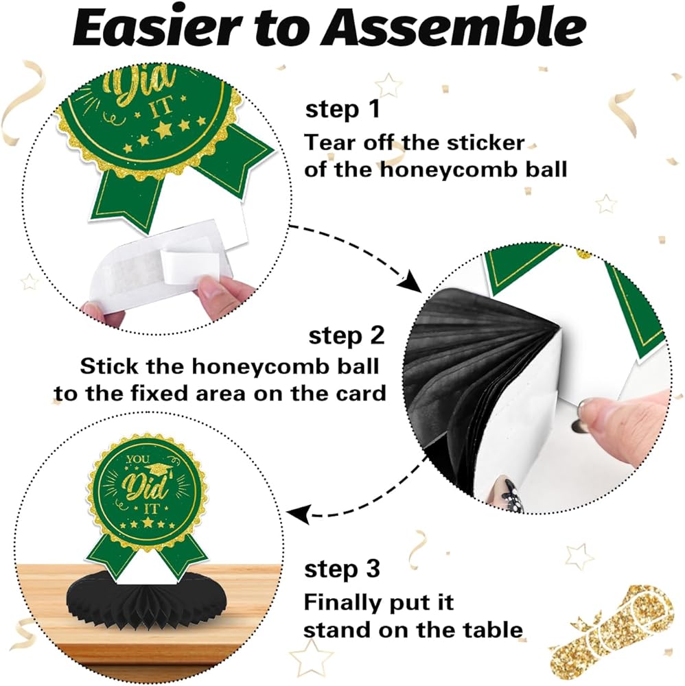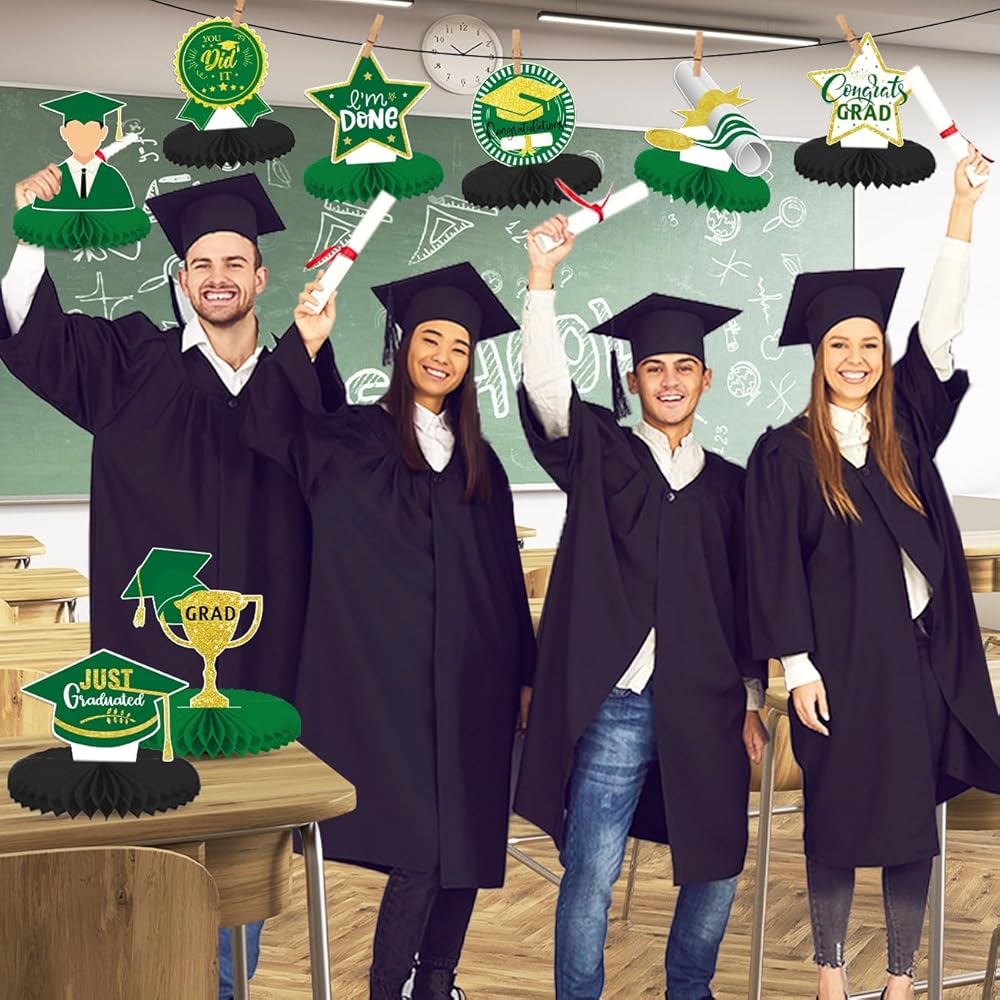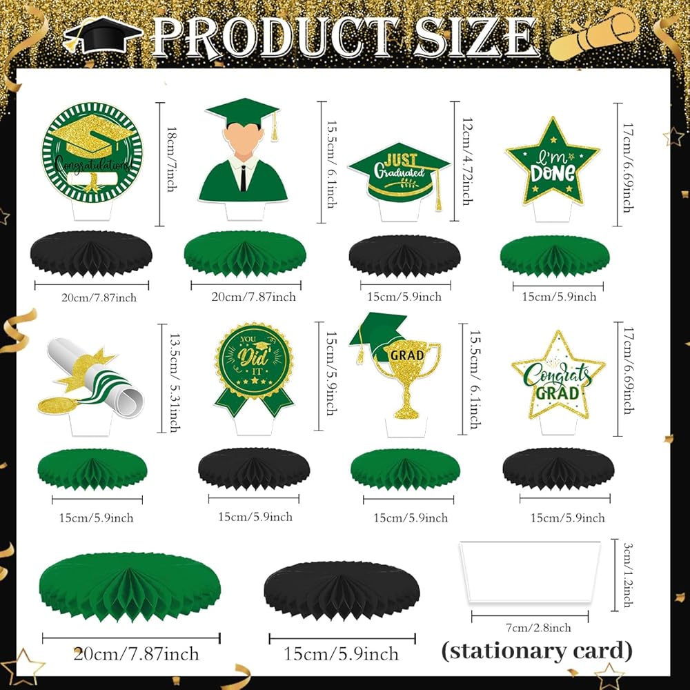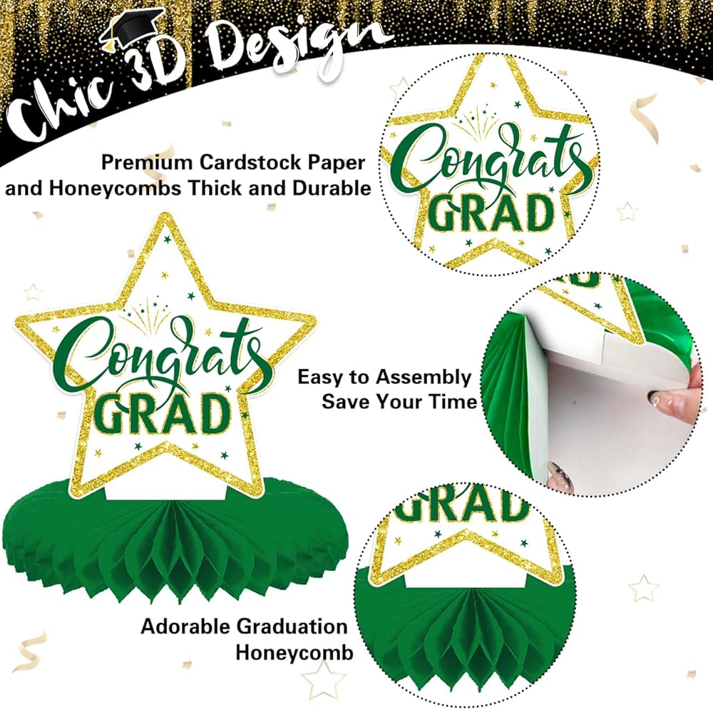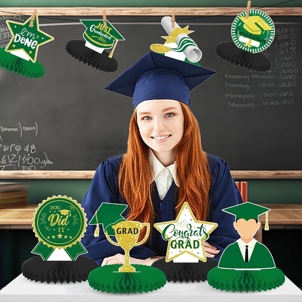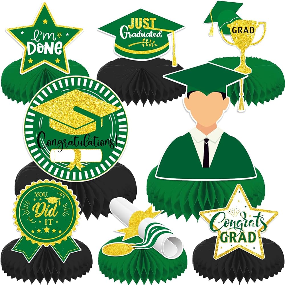 8 قطع من القطع المركزية للتخرج باللونين الأخضر والذهبي 2024 ديكورات طاولات حفلات التخرج باللون الأخضر فئة 2024، قطعة علوية للطاولة على شكل قرص العسل باللون الأخضر لمستلزمات حفلات التخرج
