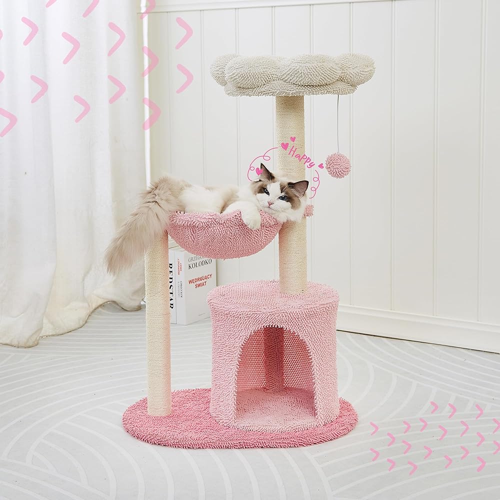 تقول الجدة أشجار القطط الوردية، برج القطط مقاس 35 بوصة للقطط الداخلية، شقة مريحة، عمود خدش للقطط السيزال الطبيعي، أرجوحة قطط مريحة وكرة متدلية
