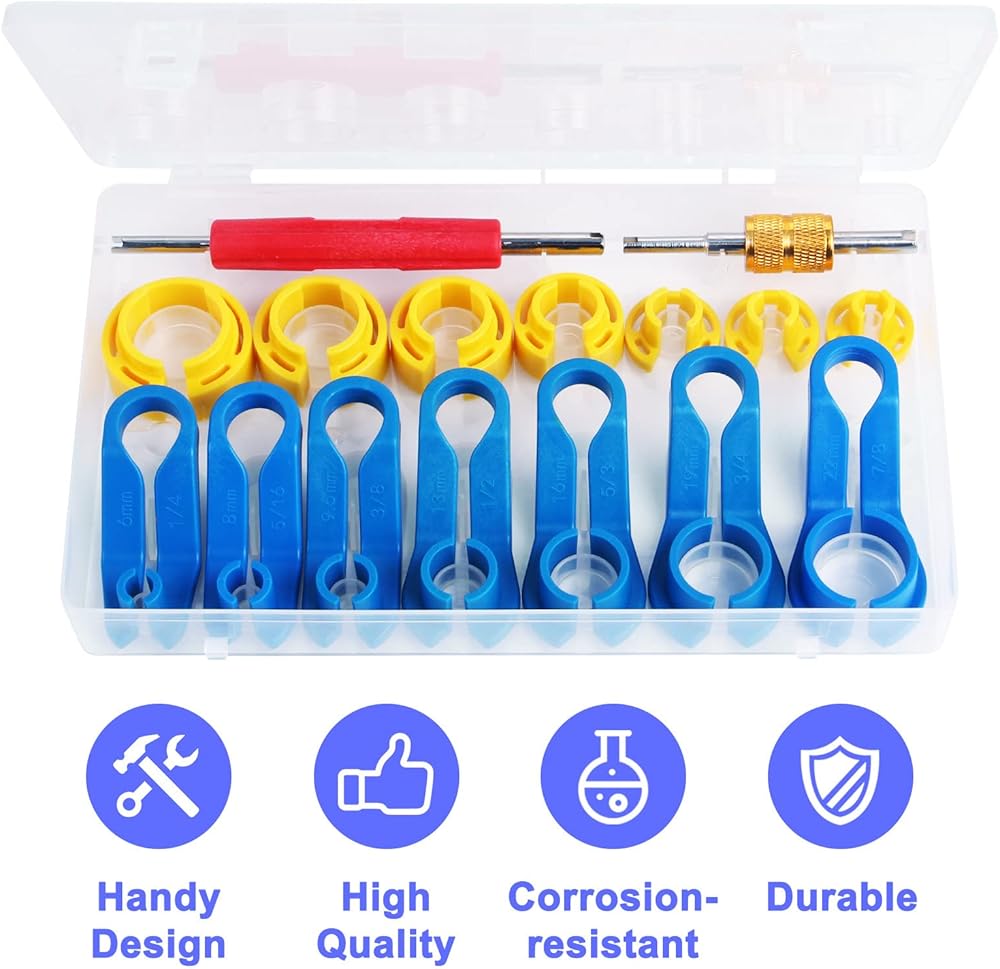 • AC Fuel Line Disconnect Tool Set :The disconnect remover tool set contains 7 pcs transmission oil cooler line remover, 7 pcs fuel line removers, 2 pcs dual head valve core removers, totally 16 pcs. Comes with a carrying case for convenient store. Perfect for disconnecting the 1/4 inch , 5/16 inch, 3/8 inch , 1/2 inch , 5/8 inch , 3/4 inch , 7/8 inch fuel line. So many quantities to meet your daily needs