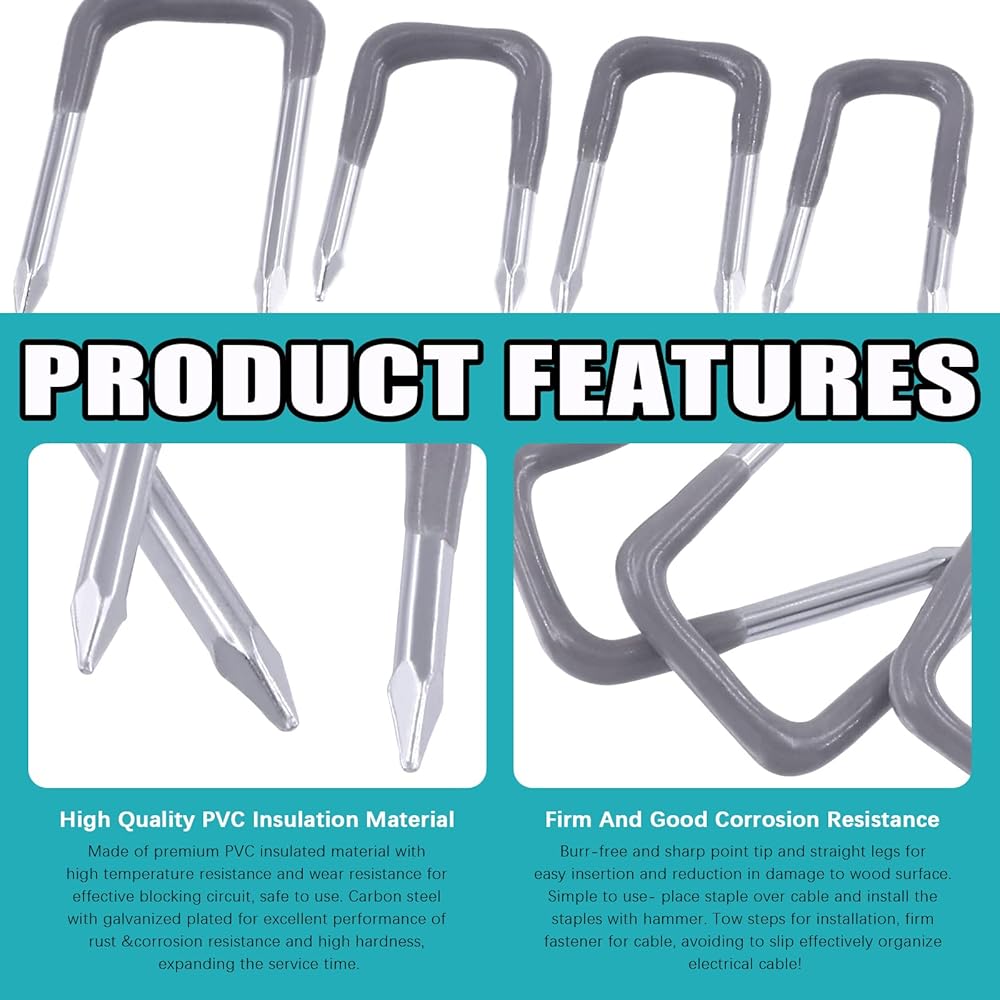 Easy to use: Place staple over cable and install by hammer. Sharp points without burr, easy for starting. U shape design and Recessed head drives faster, protecting cable insulation.